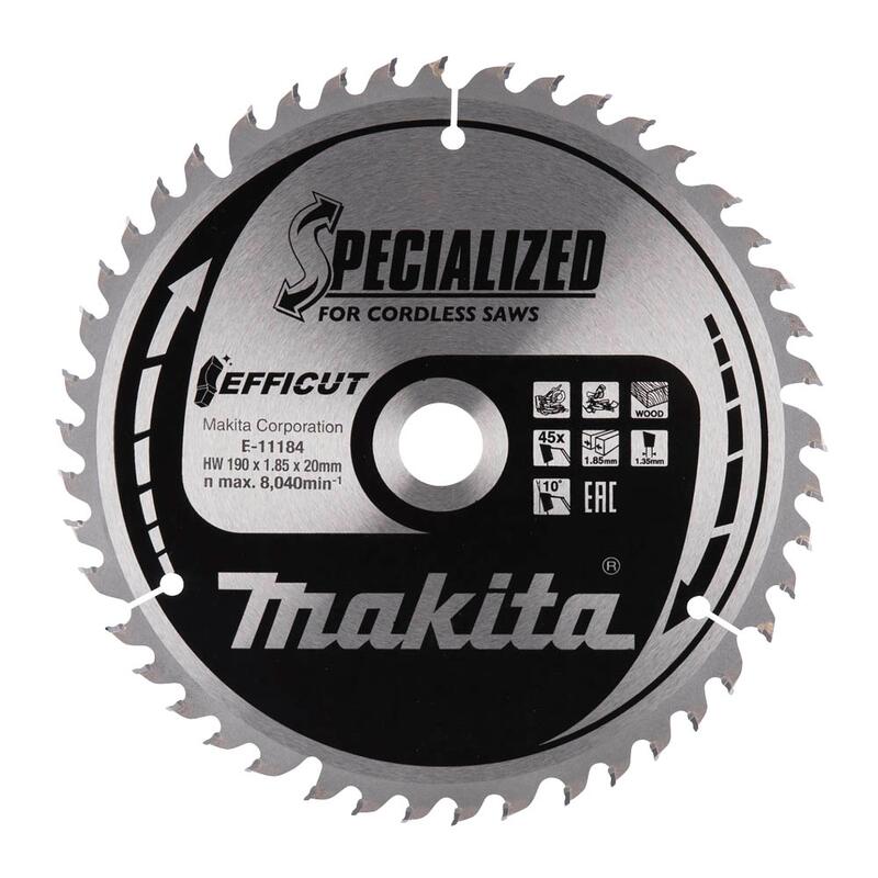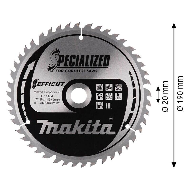 Das makita Kreissägeblatt E-11184 überzeugt durch seine präzise Verarbeitung und hohe Leistungsfähigkeit. Mit einem Durchmesser von 190 mm und einer Bohrung von 20 mm ist es optimal auf handelsübliche Kreissägen abgestimmt. Die Ausführung mit der Zahnform Efficut sorgt für saubere und effiziente Schnitte, die besonders beim Bearbeiten von Holz zum Tragen kommen. Insgesamt verfügt das Sägeblatt über 45 Zähne, die eine feine Schnittführung ermöglichen und das Material schonen.