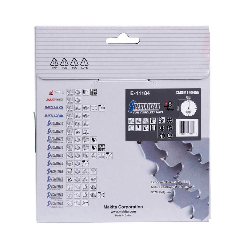 Die Schnittbreite von 1,85 mm gewährleistet eine stabile Führung des Sägeblattes und minimiert gleichzeitig den Materialverlust. Dieses Kreissägeblatt ist speziell für die Bearbeitung von Holz ausgelegt und bietet durch seine hochwertige Konstruktion eine lange Lebensdauer sowie eine gleichbleibend hohe Schnittqualität. Die Kombination aus robustem Material und der präzisen Zahngeometrie macht das makita Sägeblatt E-11184 zu einem verlässlichen Werkzeug für professionelle Anwender und Heimwerker, die Wert auf exakte Schnitte legen.