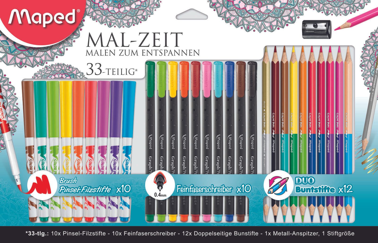 - Inhalt: 10x Pinsel-Filzstift Color'Peps Brush, 10x Feinfaserschreiber Graph'Peps, 12x Doppelseitige Buntstifte Color'Peps Duo, 1x Metall-Anspitzer