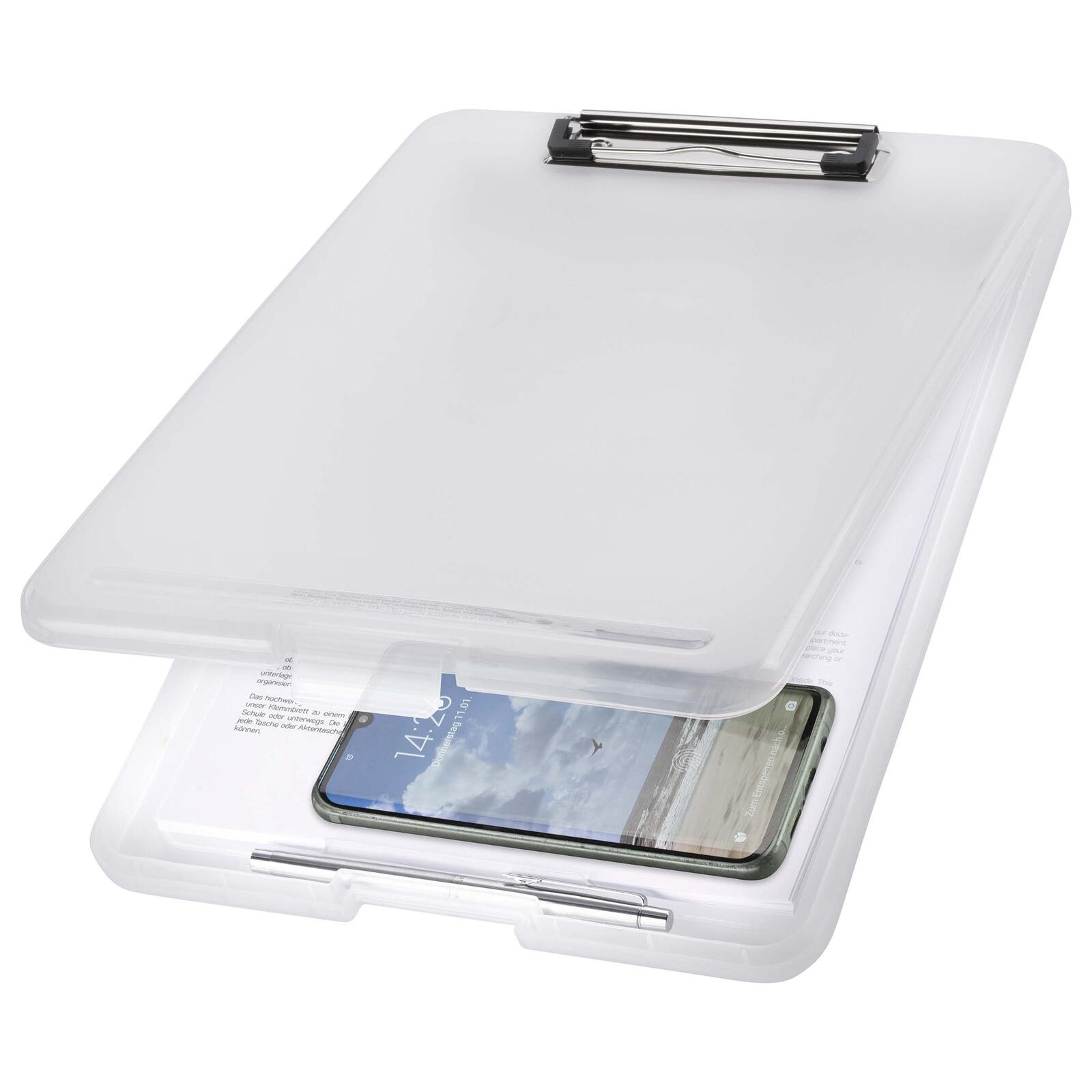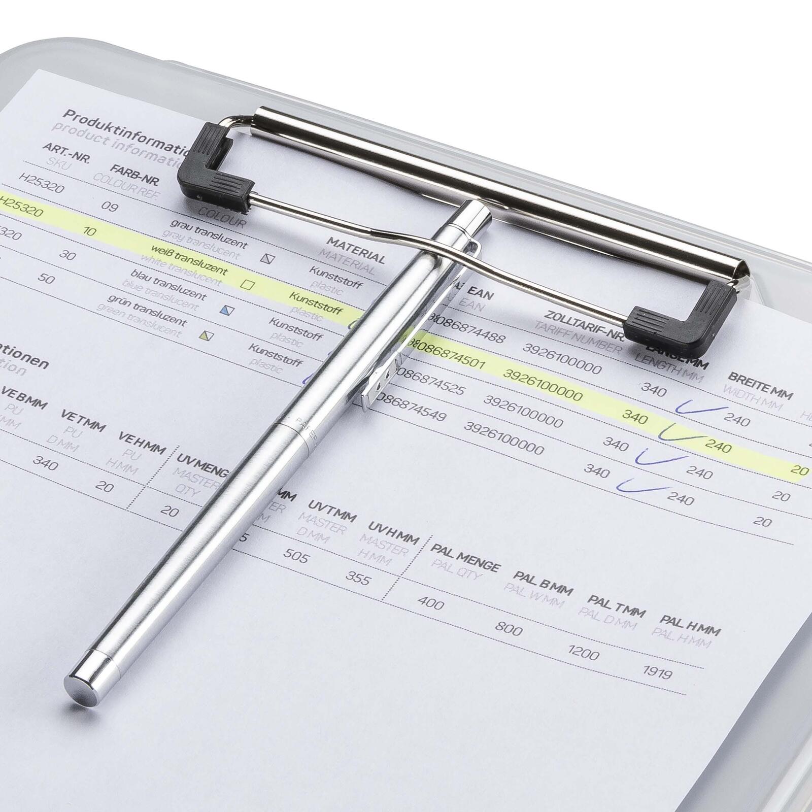 Hergestellt aus hochwertigem Kunststoff, kombiniert dieses Klemmbrett Funktionalität mit ansprechendem Design. Die transluzente Farbe verleiht dem Klemmbrett eine moderne Note, während es gleichzeitig den Blick auf den Inhalt ermöglicht. Die Klemme aus robustem Metall in nickel sorgt dafür, dass deine Blätter sicher an ihrem Platz bleiben, ohne sie zu beschädigen.