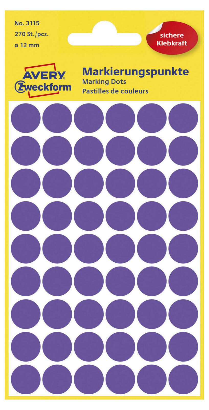 Die violetten runden Klebepunkte von AVERY Zweckform sind perfekt für deine Kennzeichnungen und Markierungen geeignet. Mit einem Durchmesser von 12,0 mm bieten sie genügend Platz für klare und präzise Markierungen. Das Set enthält insgesamt 270 Stück, so dass du lange von diesem Produkt profitieren kannst.