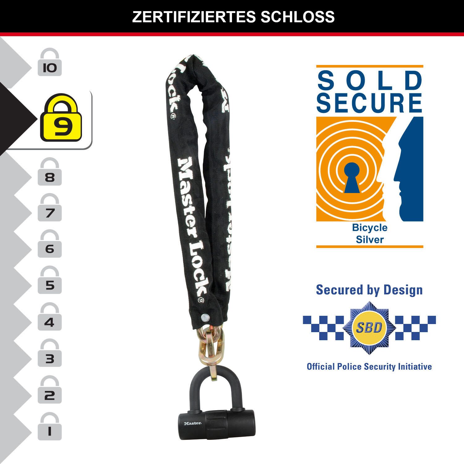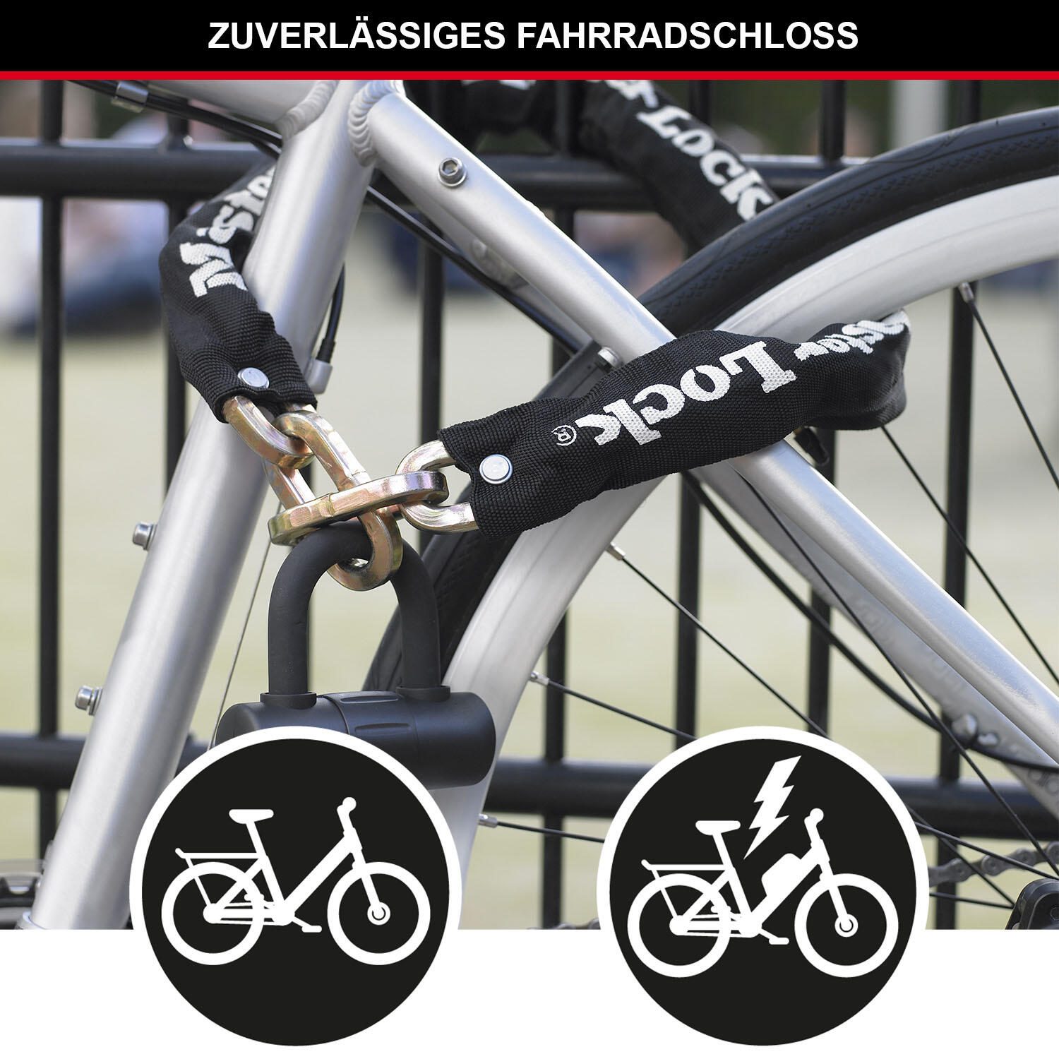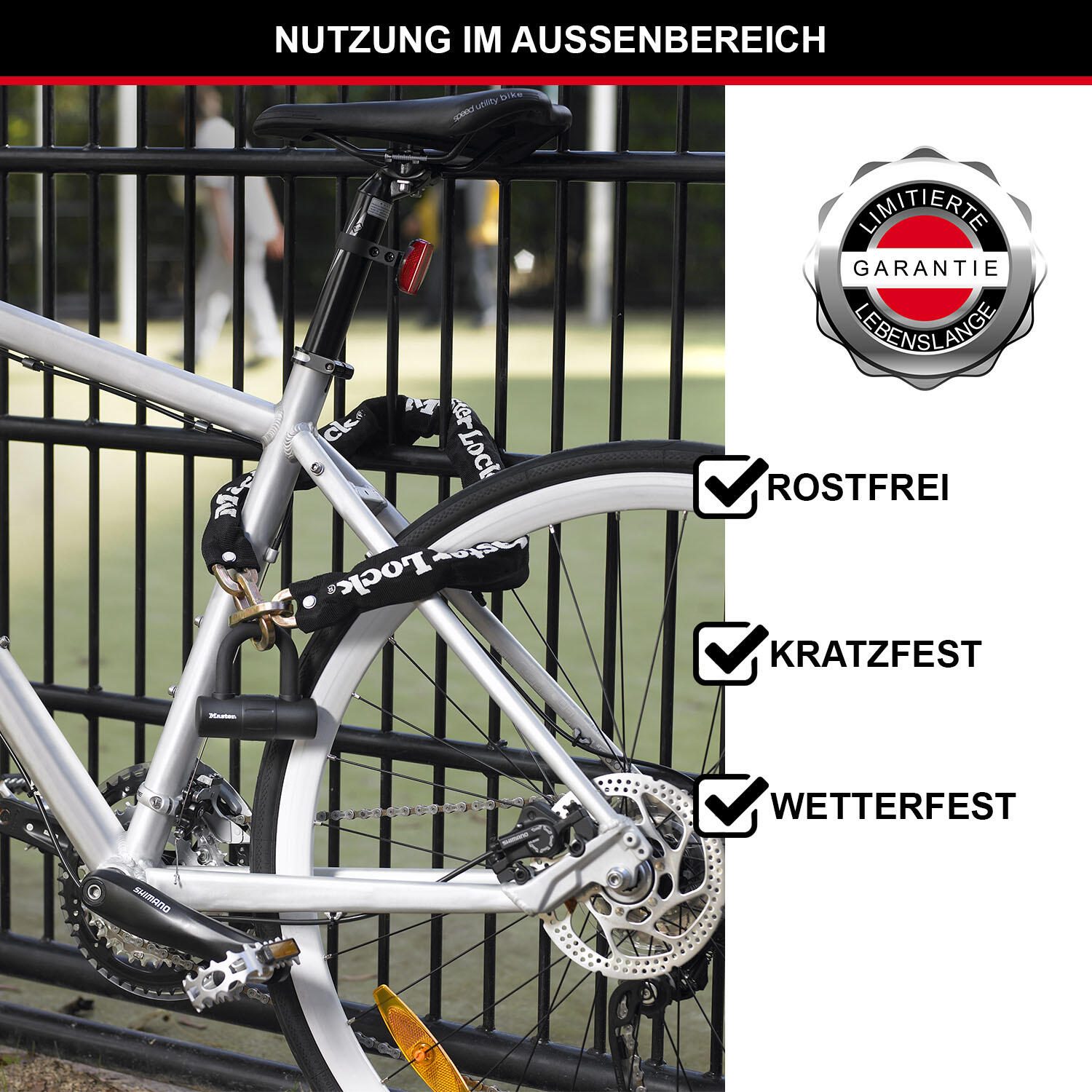 - Kette aus gehärtetem Stahl widersteht Schneidwerkzeugen, Sägen und Aufbruchversuchen. Nylonabdeckung schützt vor Kratzern. Scheiben-Schließzylinder bietet zusätzliche Sicherheit gegen Schlosspicking. Doppel-Schließbügel für maximale Sicherheit gegen