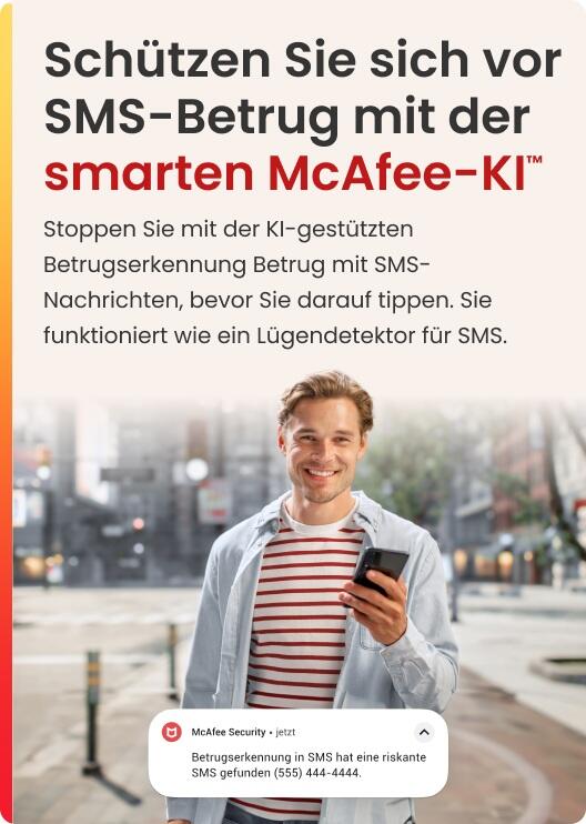 - Betrugserkennung in SMS: Die smarte McAfee-KI™ schützt Sie, wenn sie einen verdächtigen Link in Ihren SMS-Nachrichten erkennt – und falls Sie versehentlich doch darauf klicken, blockieren wir den Zugriff darauf.