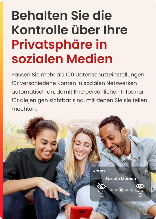 - Social Privacy Manager: Behalten Sie die Kontrolle über Ihre Privatsphäre in sozialen Medien. Mit nur wenigen Klicks können Sie mehr als 100 Datenschutzeinstellungen für Ihre Konten in sozialen Medien anpassen. Je nachdem, wie Sie soziale Medien nutzen, gibt der Social Privacy Manager Ihnen entsprechende Empfehlungen. So können Sie sicher sein, dass Ihre persönlichen Daten nur für die Personen sichtbar sind, mit denen Sie sie teilen möchten. Um sich noch besser zu schützen, können Sie sogar bestimmte Einschränkungen für die Nutzung Ihrer Daten durch soziale Medien festlegen.