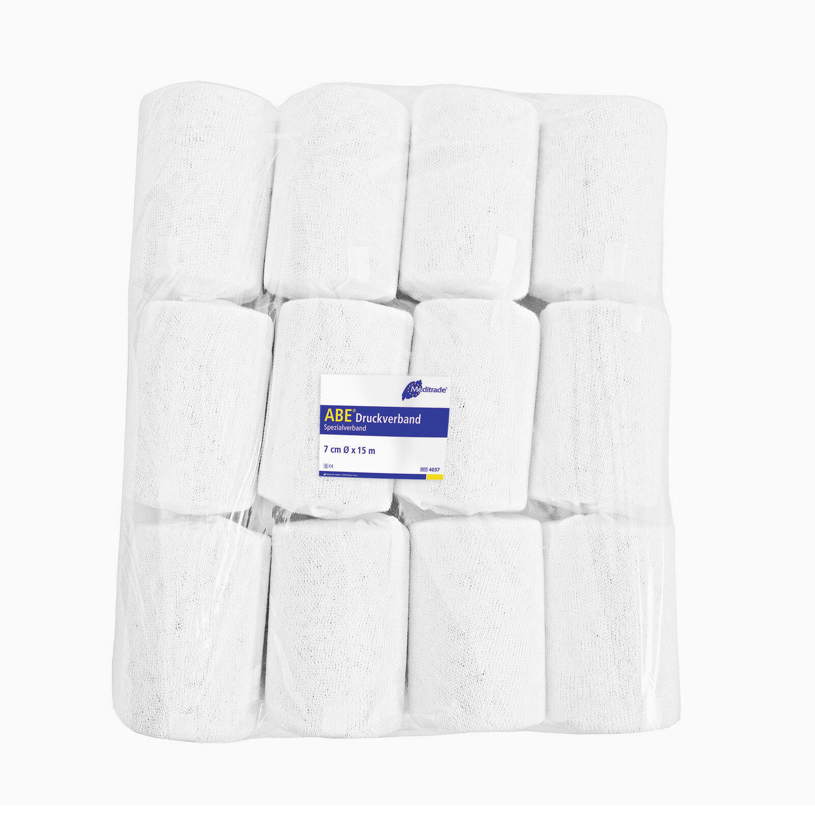 Der Meditrade® ABE® Druckverband ist ein medizinisches Produkt zur Versorgung von Wunden. Er ist gerollt und hat die Maße 7 cm in der Breite und 10 cm in der Länge. Die weiße Farbe des Verbandes sorgt für eine neutrale Optik, die in medizinischen Umgebungen üblich ist.