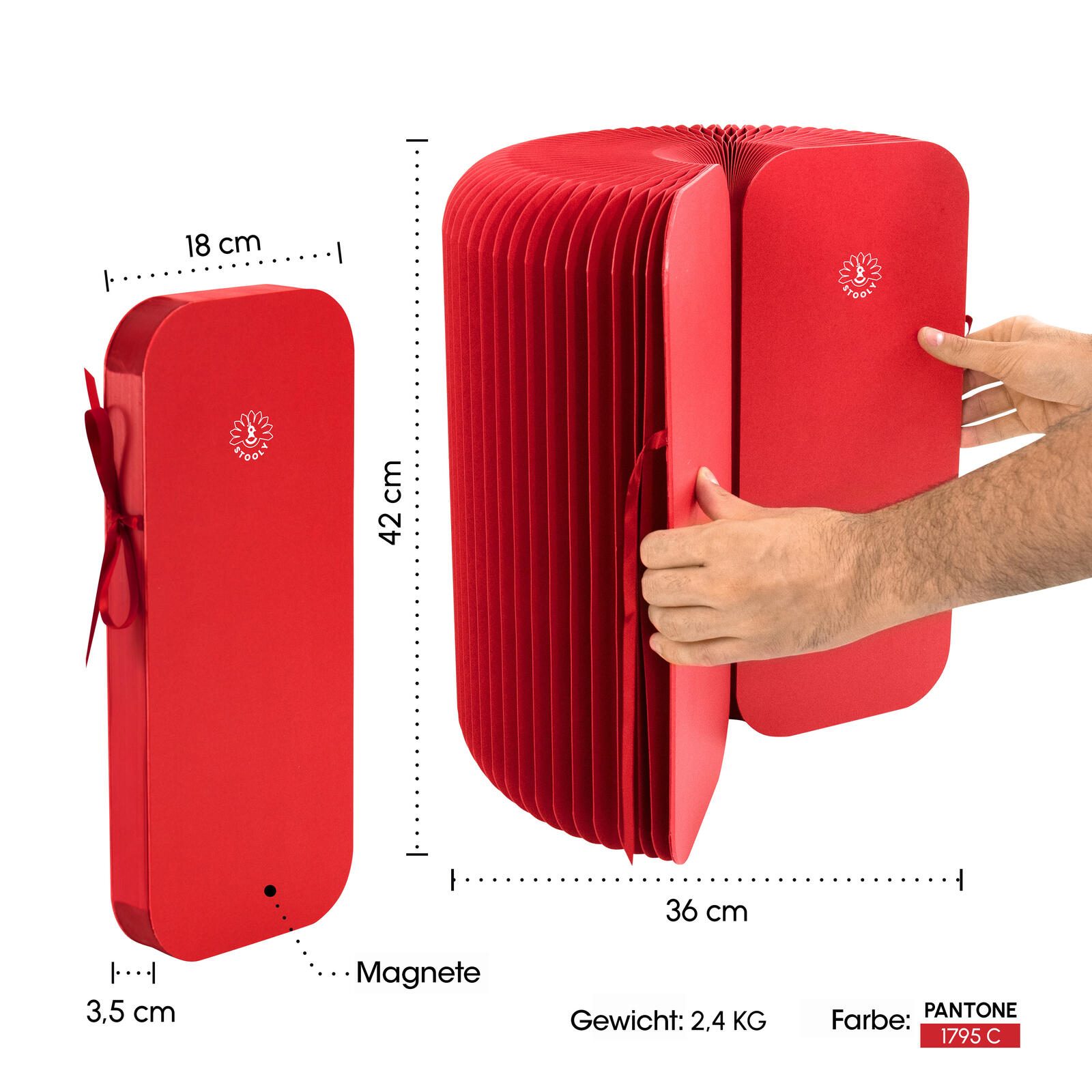 Der meet powered by PAPERFLOW Hocker Flexistool in der Farbe Rot ist ein vielseitiger und platzsparender Sitzhocker. Er zeichnet sich durch seine faltbare Bauweise aus, die dank sechs integrierter Magnete an den Seitenwänden ein schnelles Öffnen und Schließen ermöglicht. Die kompakte Sitzhöhe beträgt 42 Zentimeter, wodurch der Hocker sich gut für verschiedene Einsatzbereiche eignet, etwa als Arbeitshocker, Bürohocker oder Wohnzimmerhocker.