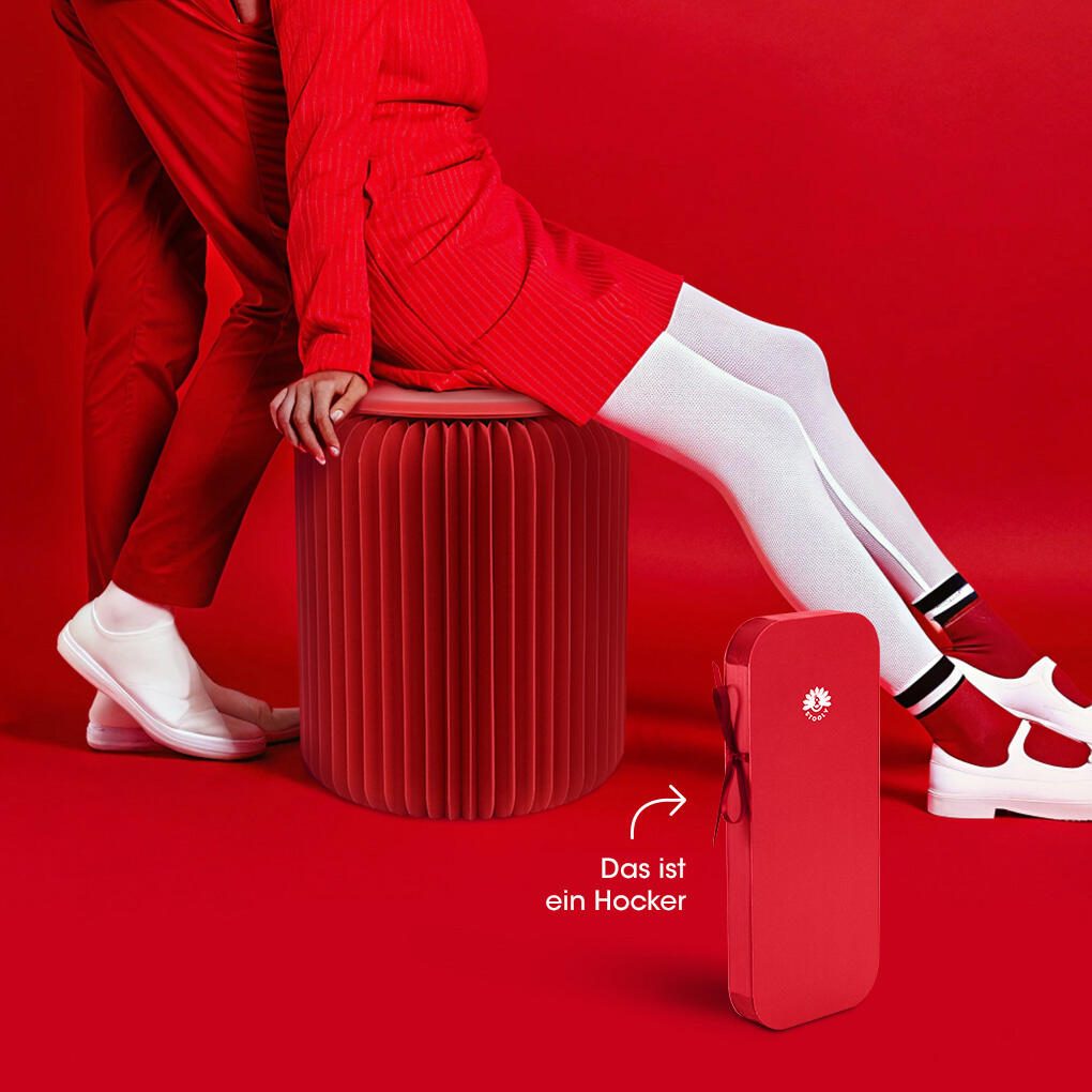 Die Sitzfläche ist mit einem Kunstlederpolster versehen, das einen angenehmen Sitzkomfort bietet. Das Material des Hockers besteht aus stabilem Wabenkarton, der trotz seines geringen Gewichts eine hohe Belastbarkeit von bis zu 300 Kilogramm gewährleistet. Das Gestell ist ohne zusätzliche Rahmenkonstruktion ausgeführt und komplett in Rot gehalten, was dem Hocker ein einheitliches und modernes Erscheinungsbild verleiht.