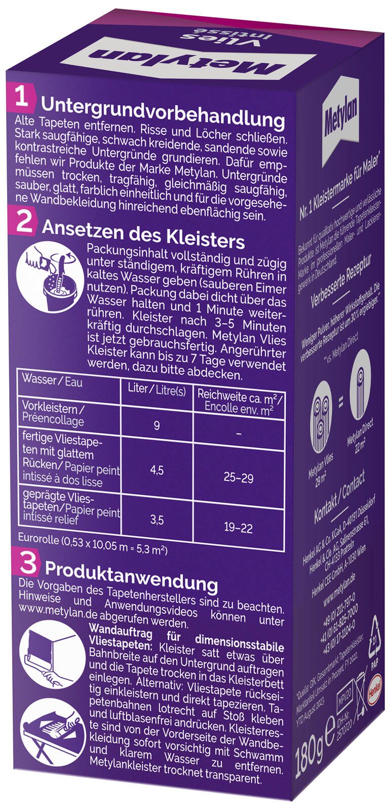 Metylan ist ein Produkt der Henkel AG & Co. KGaA mit Sitz in Düsseldorf, Deutschland. Der Hersteller ist bekannt für qualitativ hochwertige Klebstoffe und bietet mit diesem Tapetenkleister eine zuverlässige Lösung für das Anbringen von Vliestapeten. Die klare Zusammensetzung und die praktische Verpackung machen den Metylan Vlies Tapetenkleister zu einem geeigneten Produkt für Heimwerker und alle, die Wert auf eine saubere und dauerhafte Tapezierung legen.