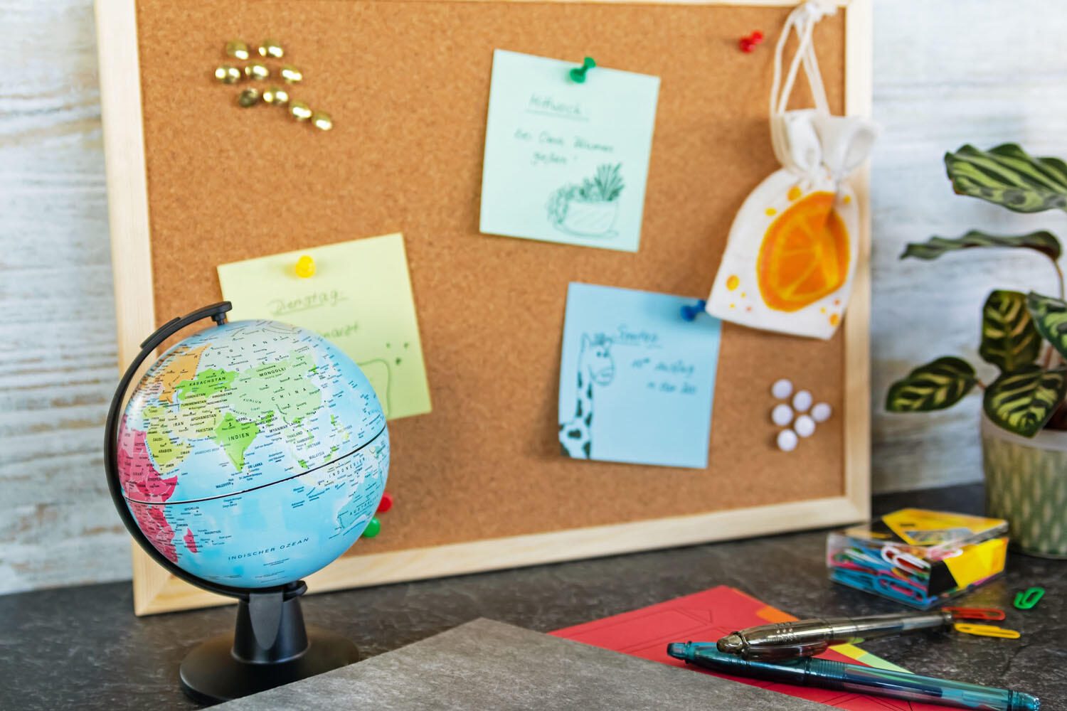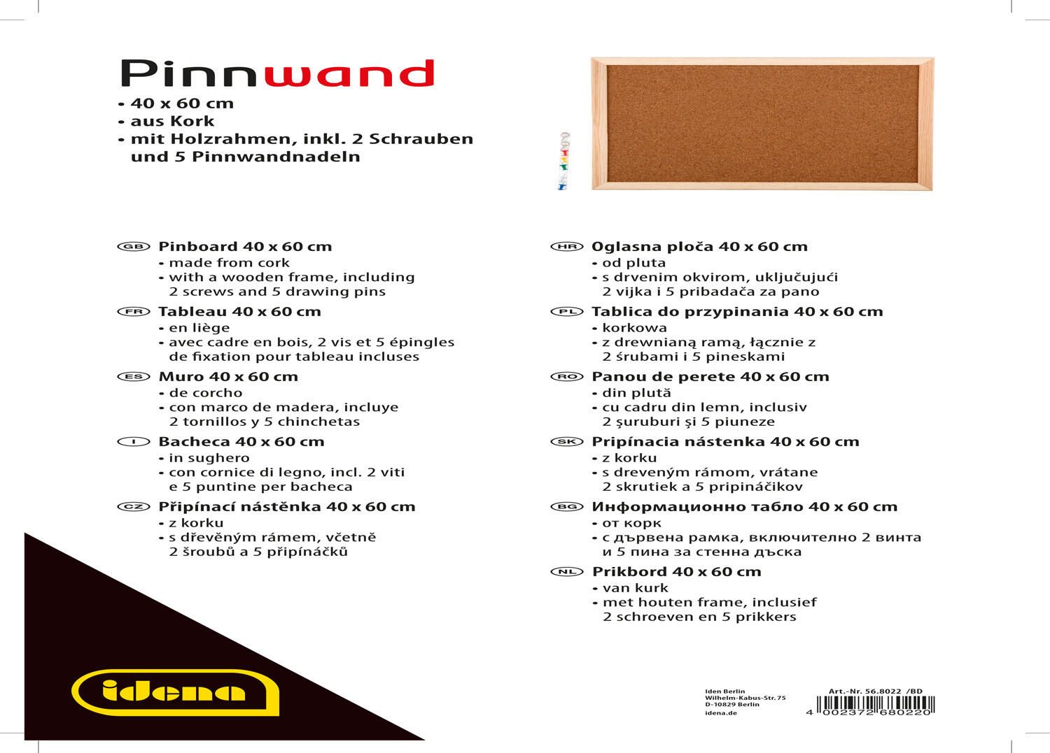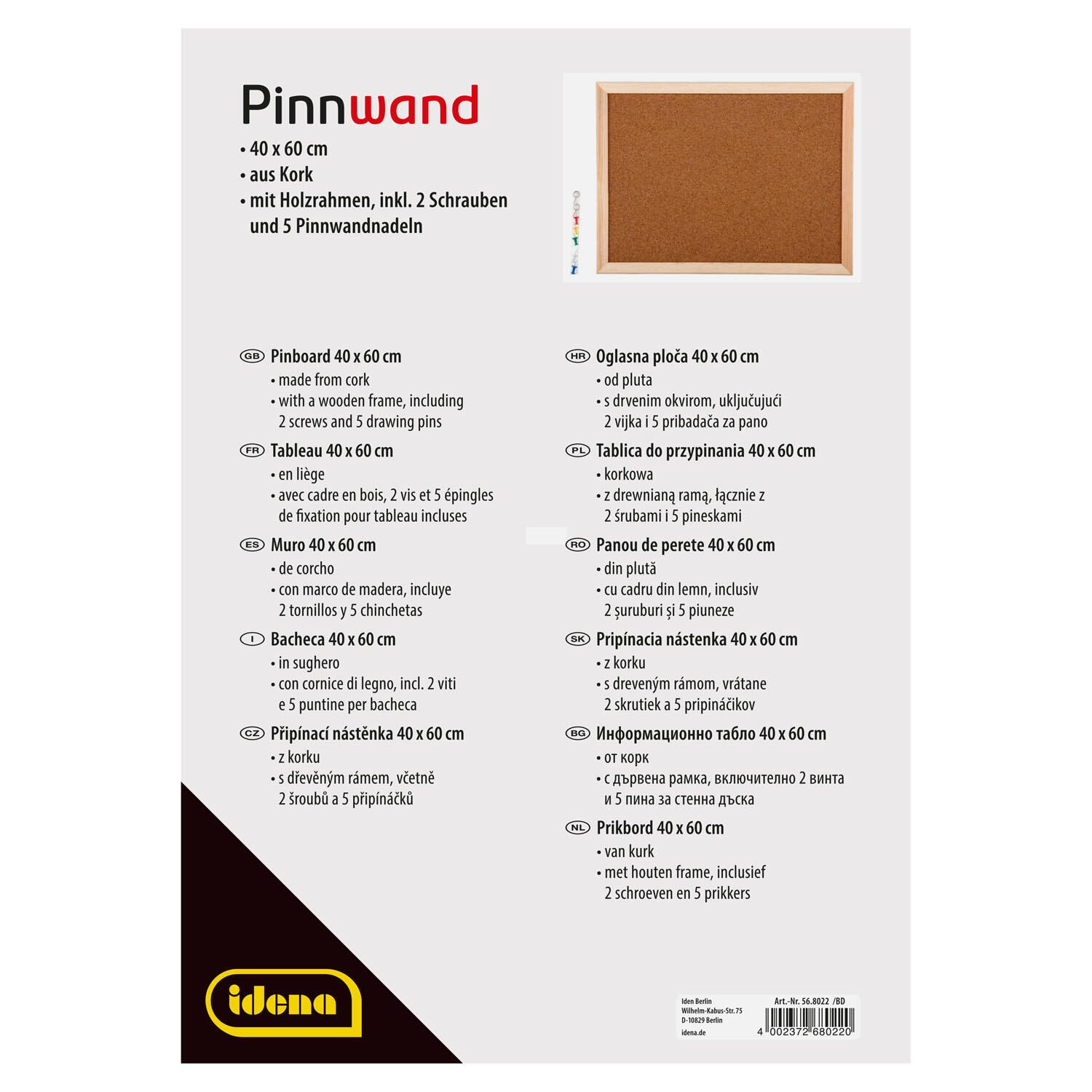 Die Idena Pinnwand mit Zubehör in der Größe 60,0 x 40,0 cm ist die ideale Lösung, um Ihre Gedanken, Erinnerungen und wichtigen Informationen stilvoll festzuhalten. Die Tafeloberfläche aus hochwertigem Kork in einem ansprechenden Braunton bietet nicht nur eine praktische Möglichkeit zum Befestigen von Notizen, sondern verleiht auch jedem Raum eine warme und einladende Atmosphäre. Dank der Montagemöglichkeit im Querformat lässt sich die Pinnwand flexibel an Ihre Wandgestaltung anpassen. Ob im Büro, im Eingangsbereich oder in der Küche – diese Pinnwand fügt sich harmonisch in jede Umgebung ein. Der robuste Holzrahmen sorgt für Stabilität und Langlebigkeit, sodass Sie lange Freude an Ihrem neuen Organisationshilfsmittel haben werden. Die Idena Pinnwand ist nicht nur funktional, sondern auch ästhetisch ansprechend. Der natürliche Korkstoff ermöglicht es Ihnen, mit Stecknadeln oder Klammern Ihre Erinnerungen und wichtigen Mitteilungen einfach zu befestigen. So haben Sie stets einen Überblick über Ihre Aufgaben und Termine, und können gleichzeitig kreative Ideen visuell festhalten. Mit einem Format von 60,0 x 40,0 cm bietet die Pinnwand ausreichend Platz für all Ihre Notizen und Bilder, ohne dabei zu viel Wandfläche einzunehmen. Sie ist somit perfekt für kleine und große Räume geeignet. Die Kombination aus praktischem Nutzen und ansprechendem Design macht die Idena Pinnwand zu einem unverzichtbaren Bestandteil Ihrer Einrichtung. Entdecken Sie die Vielseitigkeit und den Nutzen der Idena Pinnwand mit Zubehör und genießen Sie die Ordnung und Kreativität, die sie in Ihr Zuhause oder Büro bringt.Technische Daten