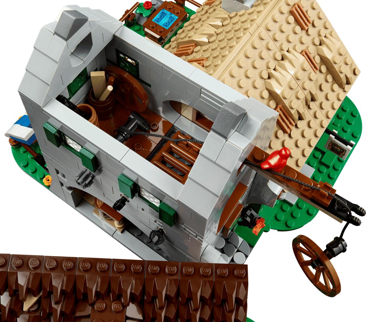 Details und Funktionen: Dieses LEGO® Icons Set strotzt vor faszinierenden Details wie dem Kran in der Schreinerei und dem Geheimfach im Gästezimmer der Dorfschenke „Zu den geborstenen Äxten“