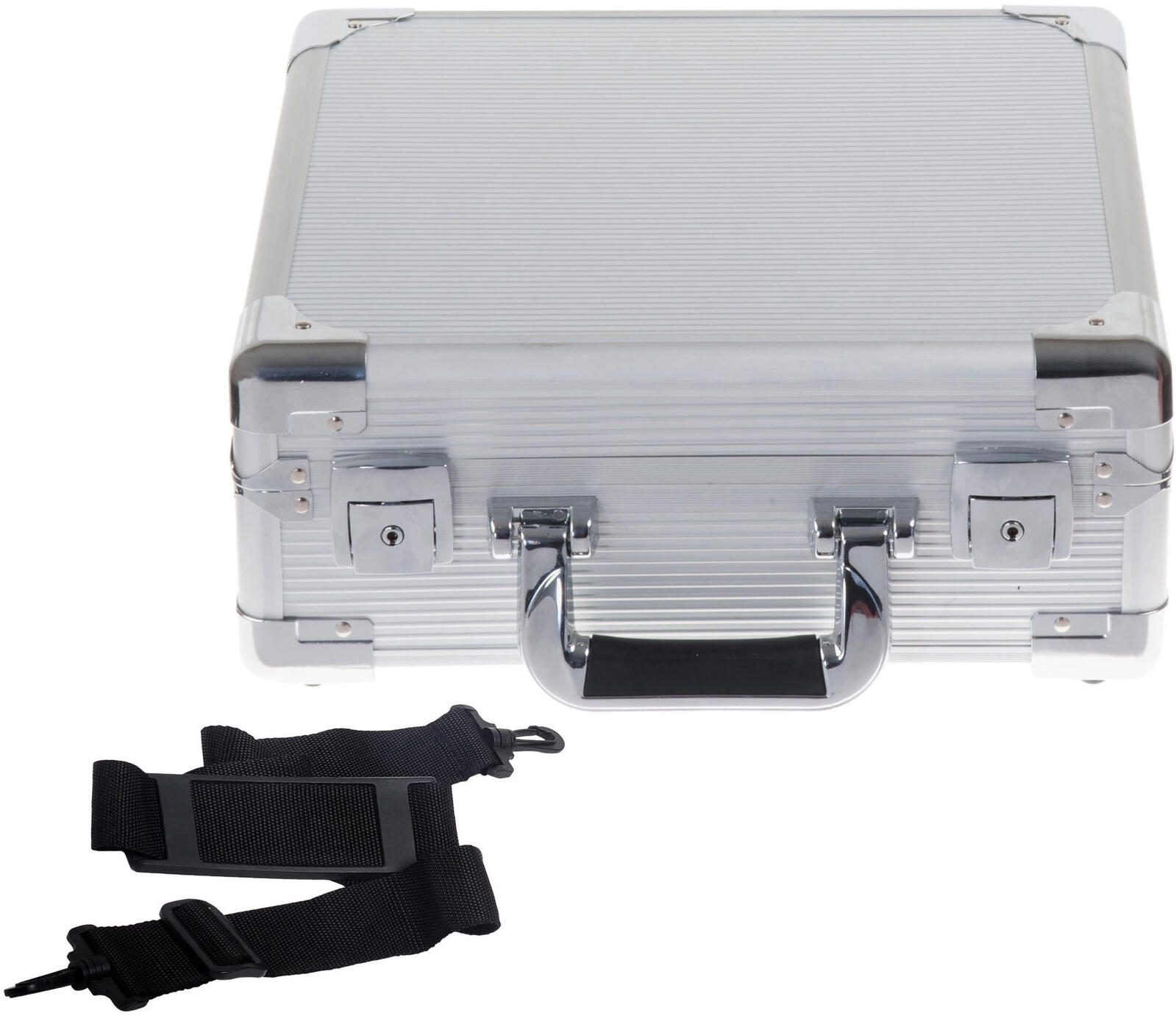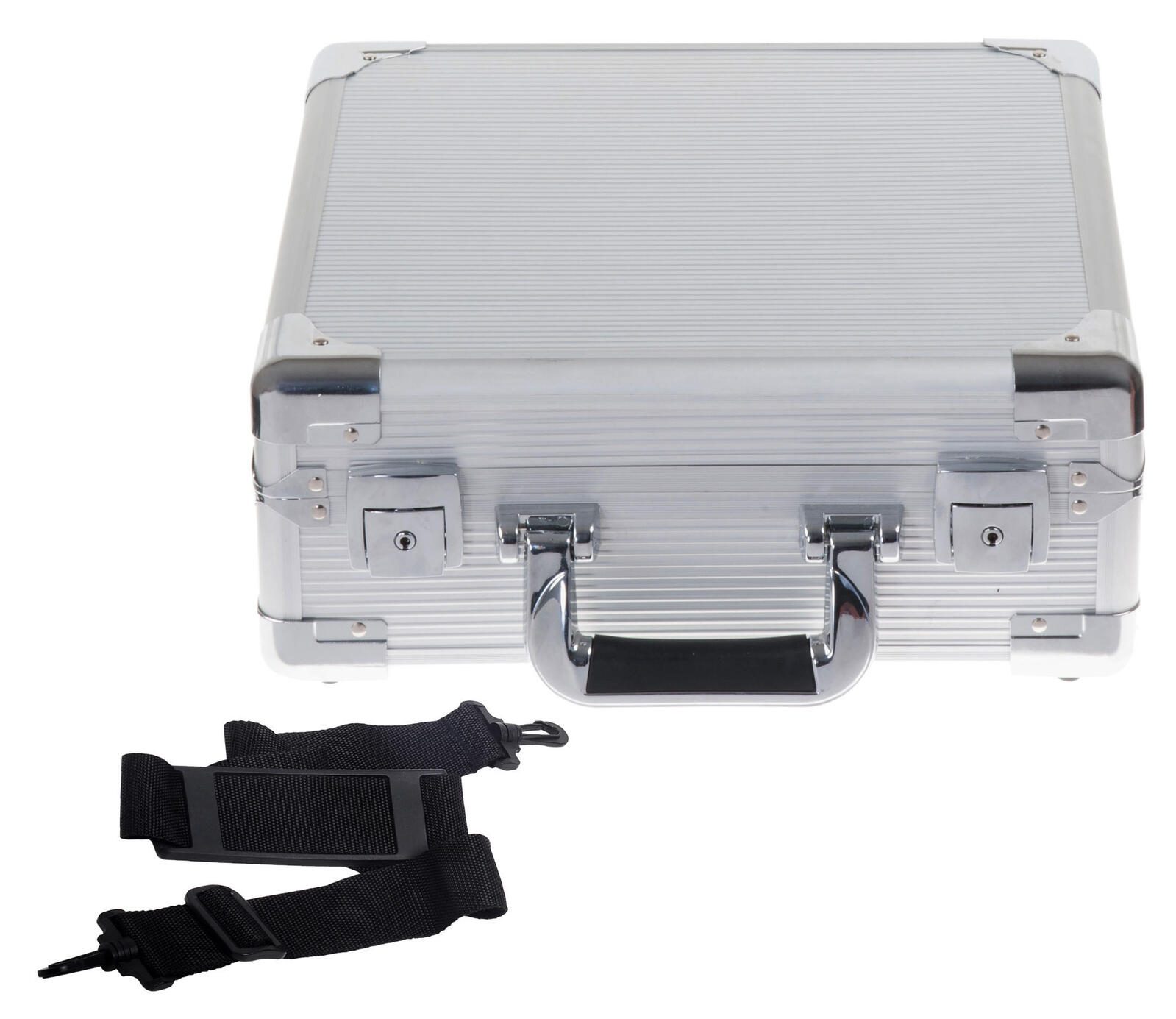 Der Koffer präsentiert sich in einem stilvollen silbernen Farbton und ist aus robustem Aluminium gefertigt. Mit Maßen von 35,0 x 35,0 x 14,0 cm bietet er ausreichend Platz für das üppige Zubehörangebot.