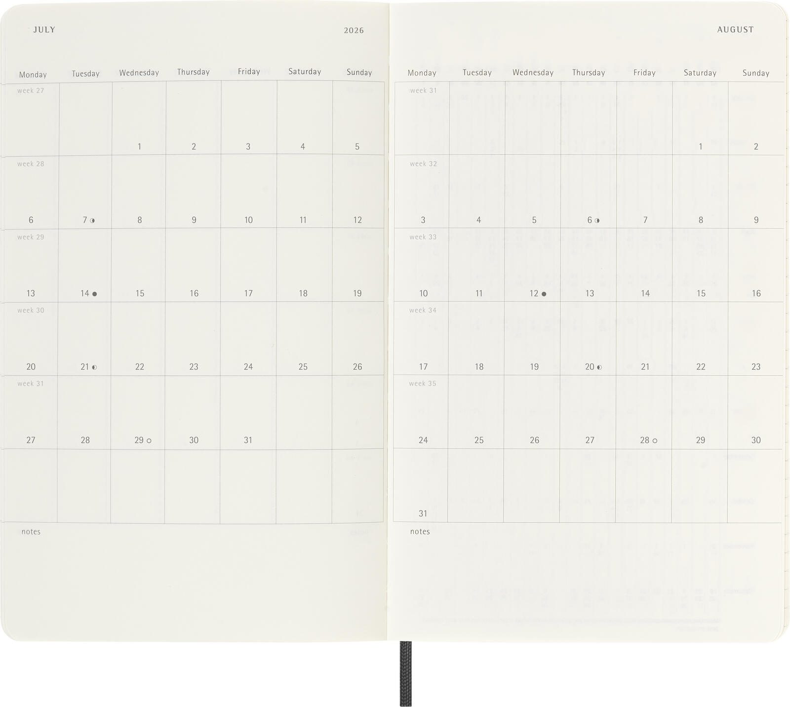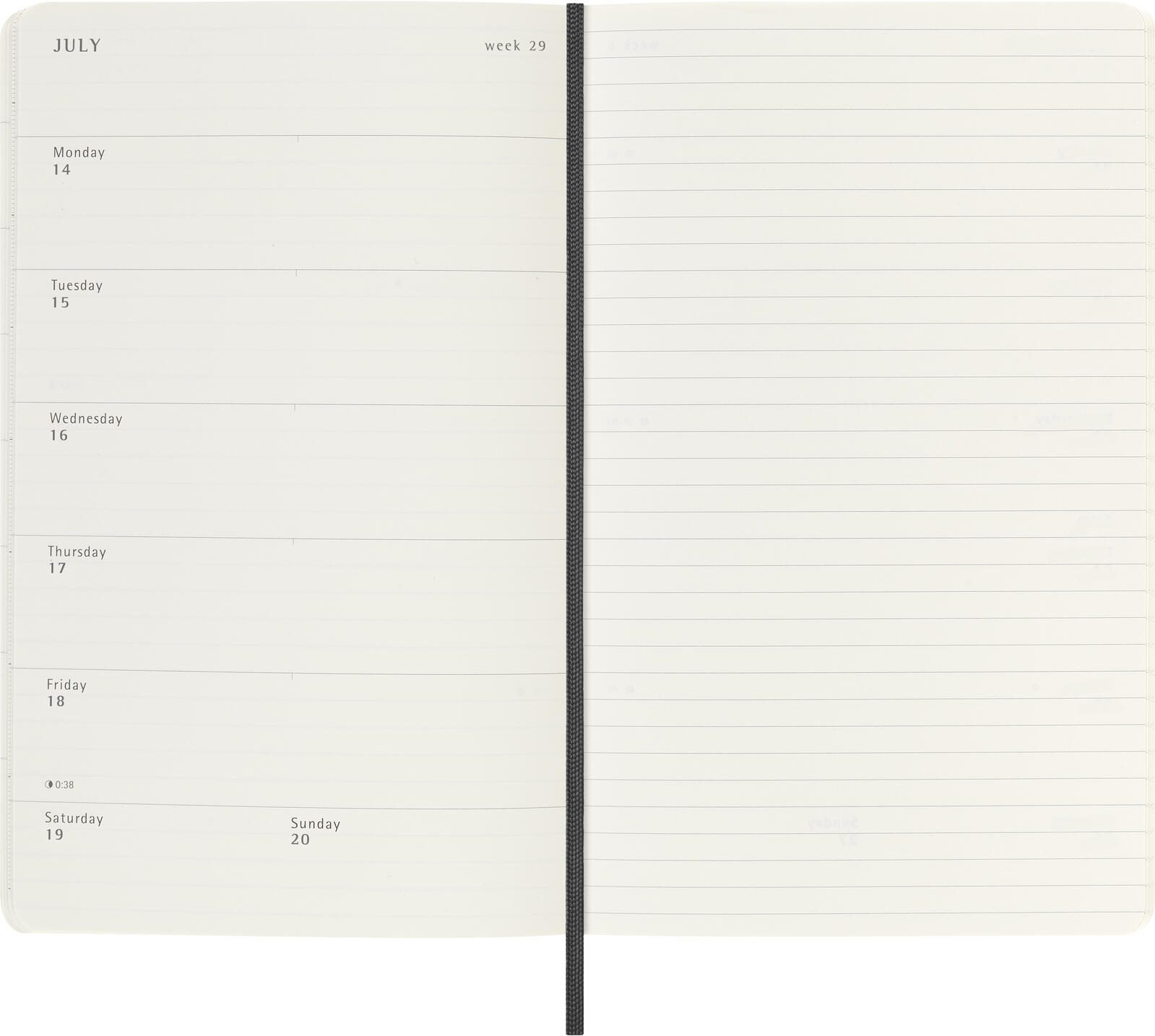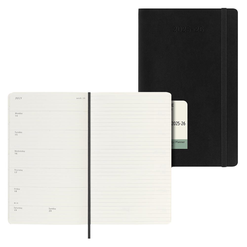 Der Einband besteht aus einem schwarzen Softcover mit einer matten Kartonoberfläche. Für sicheren Verschluss sorgt ein Gummizug, der den Kalender geschlossen hält. Die Bindung erfolgt durch eine Fadensiegelung, die eine stabile und langlebige Verarbeitung gewährleistet. Dieses Modell ist Teil der Wochenkalender-Serie von MOLESKINE und eignet sich ideal für alle, die einen verlässlichen und gut strukturierten Kalender für den Alltag suchen.