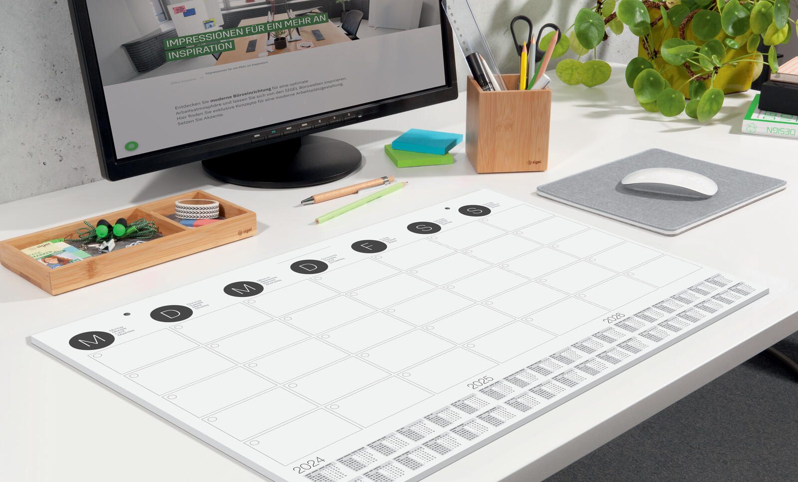 Die SIGEL Schreibtischunterlage ist ein stilvolles und funktionales Accessoire für jeden Arbeitsplatz. Mit den Maßen von 59,5 x 41,0 cm bietet sie ausreichend Platz für deine Notizen, Dokumente und kreativen Ideen. Das elegante Design in schwarz/weiß fügt sich nahtlos in jede Büroumgebung ein und sorgt für eine professionelle Atmosphäre. Diese Schreibtischunterlage ist nicht nur eine praktische Schreibunterlage, sondern auch ein nützlicher Wandkalender. Sie ist mit einem Kalendarium für die Jahre 2020, 2021 und 2022 ausgestattet, was dir hilft, deine Termine und Aufgaben stets im Blick zu behalten. Der integrierte Tages- und Wochenplan ermöglicht eine einfache Organisation deines Arbeitsalltags und unterstützt dich dabei, effizienter zu arbeiten. Hergestellt aus hochwertigem Papier mit einem Gewicht von 120 g/m², bietet die Unterlage eine angenehme Schreiboberfläche. Die robuste Kartonunterseite sorgt zudem für Stabilität und Langlebigkeit, sodass du diese Unterlage über einen längeren Zeitraum nutzen kannst, ohne dass sie an Qualität verliert. Mit insgesamt 12 Seiten bietet die SIGEL Schreibtischunterlage genügend Platz, um deine Gedanken festzuhalten und wichtige Informationen zu notieren. Sie ist ideal für Schüler, Studenten und Berufstätige, die Wert auf eine gut organisierte und ansprechende Arbeitsumgebung legen. Verleihe deinem Schreibtisch mit dieser praktischen und stilvollen Schreibtischunterlage einen Hauch von Eleganz und Ordnung.Technische Daten