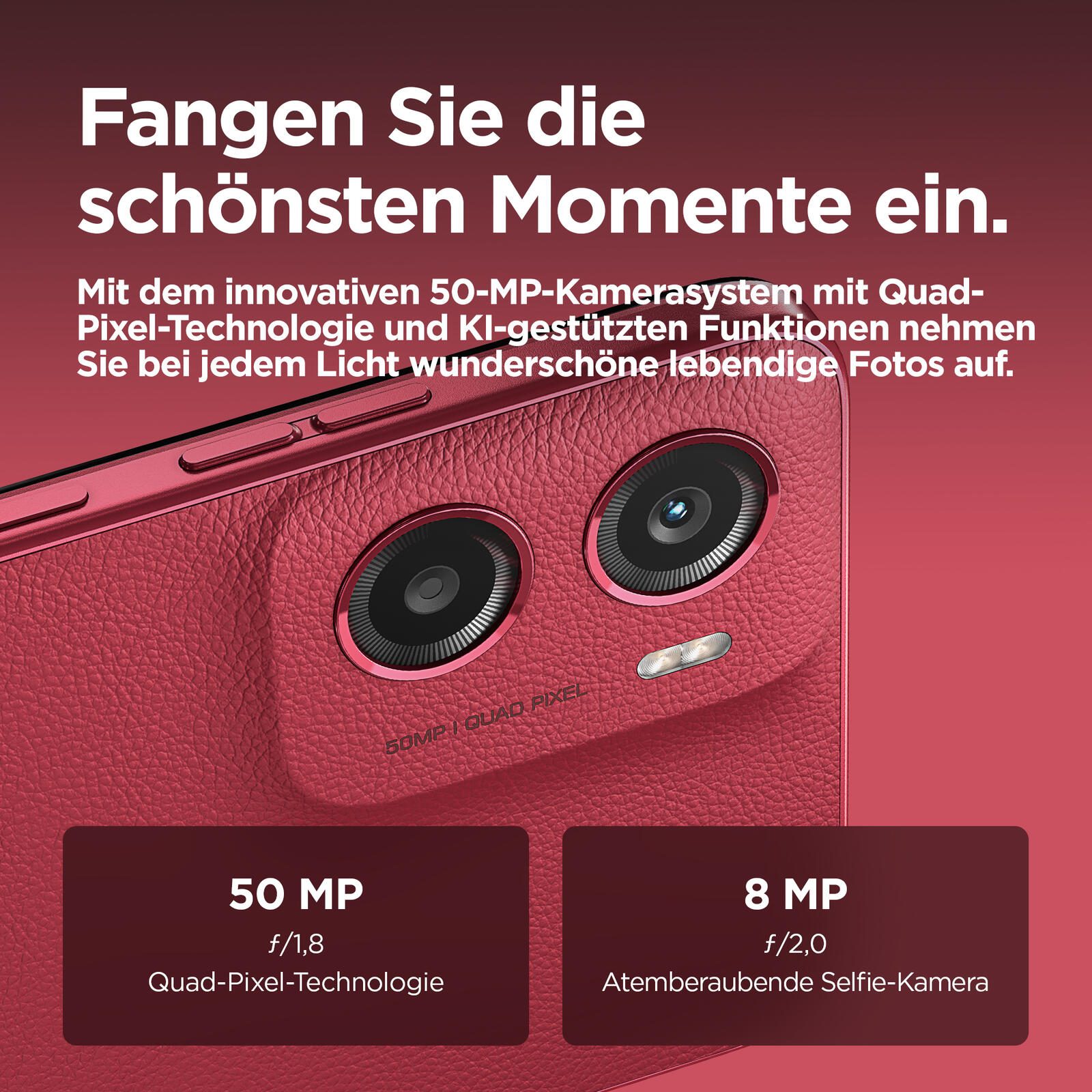 Erlebe eine ausgezeichnete Bild- und Tonqualität mit dem neuen moto g05. Schau deine Lieblingsserien und -filme auf dem gestochen scharfen und brillanten 6,67" Display – selbst bei Sonnenschein. Genieße Rundum-Sound dank Stereo-Lautsprechern mit Bass-Boost. Nimm mit dem 50-MP-Quad-Pixel-Kamerasystem(2) mit KI-gestützter Porträt-Funktion bei Tag und Nacht wunderschöne, gestochen scharfe Fotos auf. Und freu dich auf noch mehr Speed, ultraeffiziente Performance und bis zu 12 GB RAM mit RAM-Boost(5). Mit seinem Finish aus veganem Kunstleder, dem wasserabweisenden Design(4) und Corning® Gorilla® Glass 3 bietet das moto g05 Style und Langlebigkeit zugleich. Der 5200-mAh-Akku hält lange durch und dank TurboPower™ ist dein Smartphone blitzschnell wieder aufgeladen. Außerdem bietet es jede Menge Speicherplatz für deinen Content. Das moto g05 – in jeder Hinsicht beeindruckend.