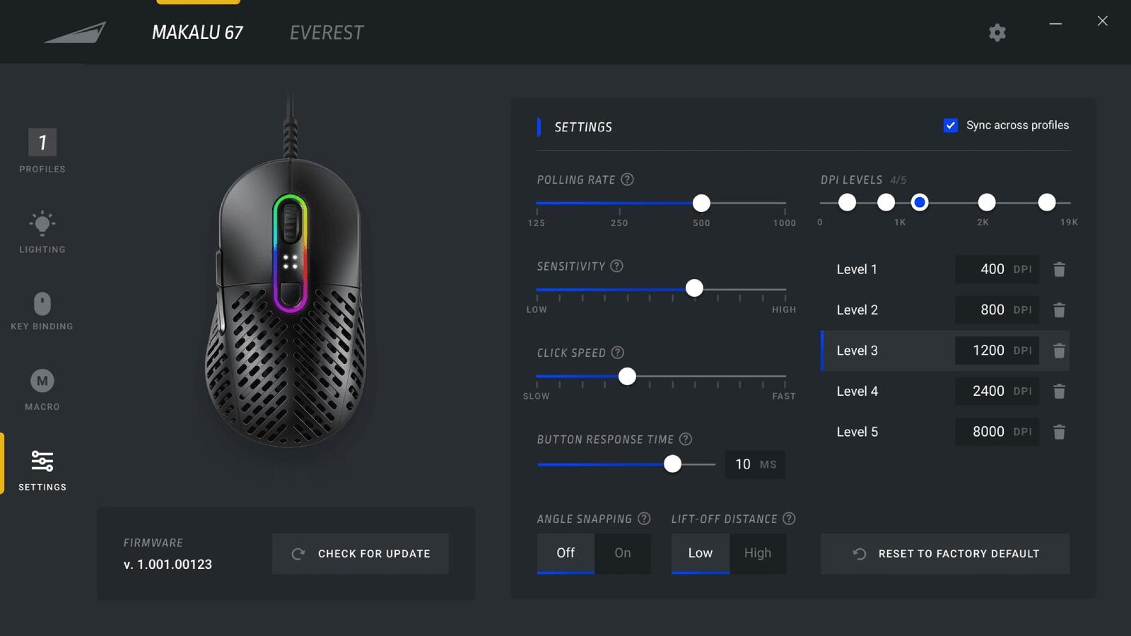 SICHTBARE KONTROLLEVerlieren Sie nie die Kontrolle über Ihre DPI-Einstellungen mit einer speziellen DPI-Taste und 4 Anzeige-LEDs. Bis zu 5 DPI-Konfigurationen zwischen 100 und 19000 DPI können in Base Camp definiert und auf Ihrem Makalu 67 gespeichert werden, sodass Sie Ihr Setup ganz einfach unterwegs mitnehmen können. |