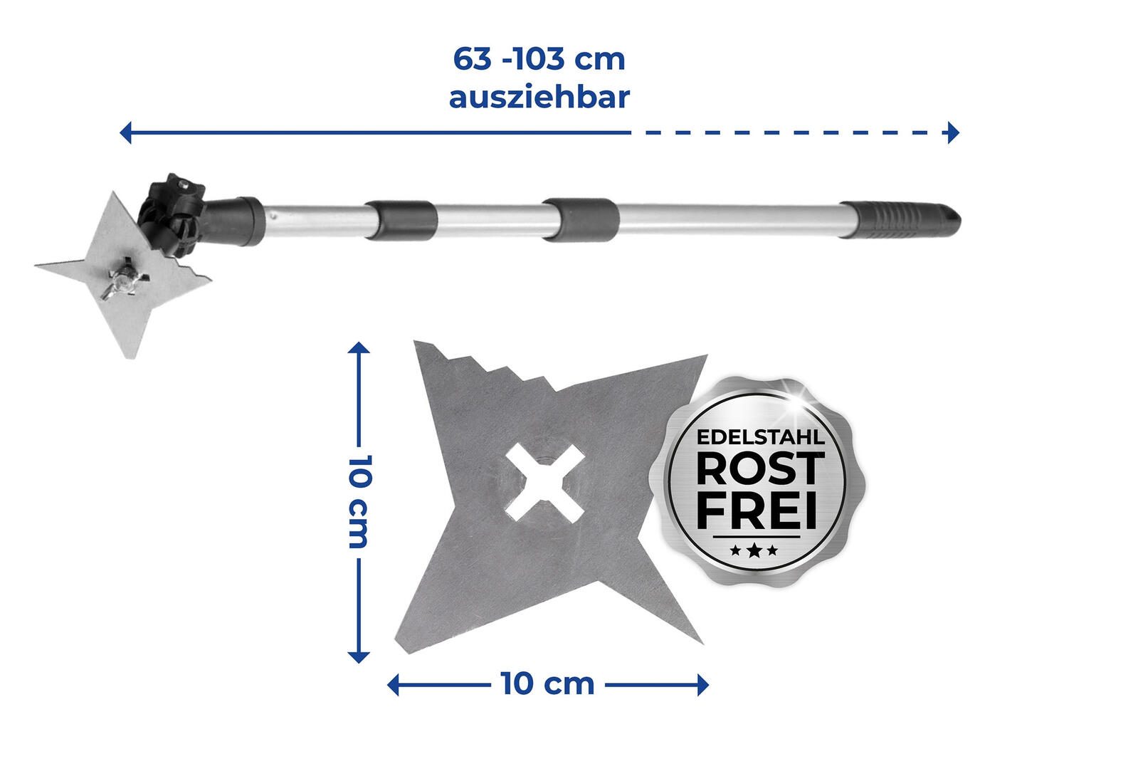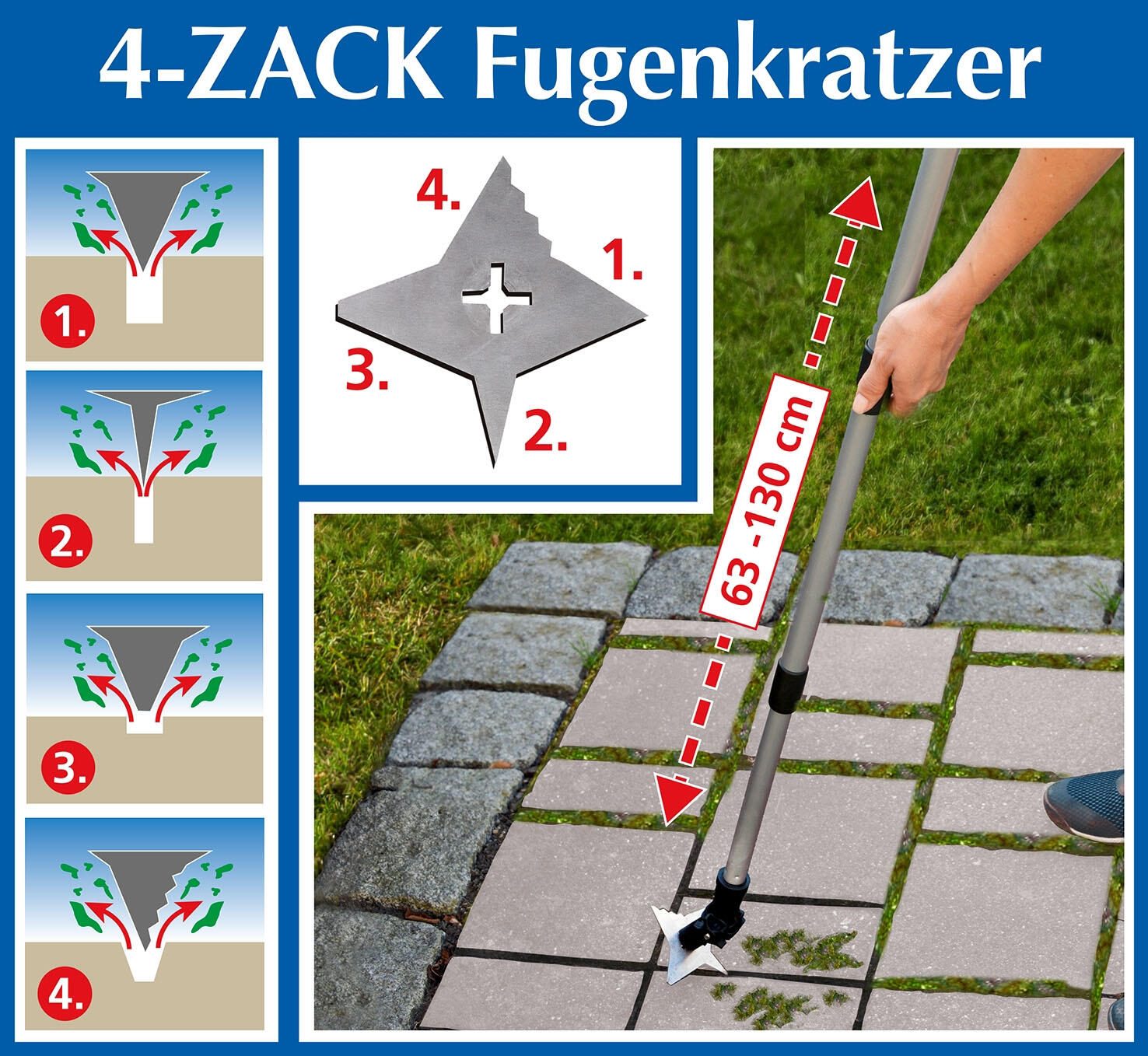 Der 4-Zack-Fugenkratzer ist das ideale Werkzeug für die effektive Beseitigung von hartnäckigem Grünbewuchs in Fugen. Mit seinem verstellbaren Gelenkkopf passt sich der Fugenkratzer flexibel an verschiedene Fugenbreiten und -formen an, was die Handhabung enorm erleichtert. Die vier gezackten Schneiden sorgen dafür, dass auch tiefsitzende Wurzeln und Unkraut effizient entfernt werden können, ohne die umgebenden Flächen zu beschädigen. Die Konstruktion des Fugenkratzers ist auf Langlebigkeit und Robustheit ausgelegt, sodass Sie auch bei intensiver Nutzung von der hohen Qualität profitieren. Durch die gezackten Klingen wird eine optimale Schneidleistung erzielt, die es Ihnen ermöglicht, auch die hartnäckigsten Pflanzenreste mühelos zu entfernen. Dies spart Zeit und Aufwand im Garten, da Sie nicht mehr auf chemische Unkrautvernichter zurückgreifen müssen. Dank des ergonomischen Designs liegt der 4-Zack-Fugenkratzer angenehm in der Hand und ermöglicht ein komfortables Arbeiten, selbst über längere Zeiträume. Ob im heimischen Garten oder auf der Terrasse, dieses Werkzeug ist ein unverzichtbarer Helfer für alle Gartenliebhaber, die Wert auf eine gepflegte Umgebung legen. Mit dem 4-Zack-Fugenkratzer treffen Sie eine ausgezeichnete Wahl für die Pflege Ihrer Fugen und die Bekämpfung unerwünschten Pflanzenwuchses. Vertrauen Sie auf die Qualität und Effizienz dieses praktischen Werkzeugs, um Ihre Gartenarbeit zu optimieren und die Schönheit Ihrer Außenanlagen zu bewahren.Technische Daten