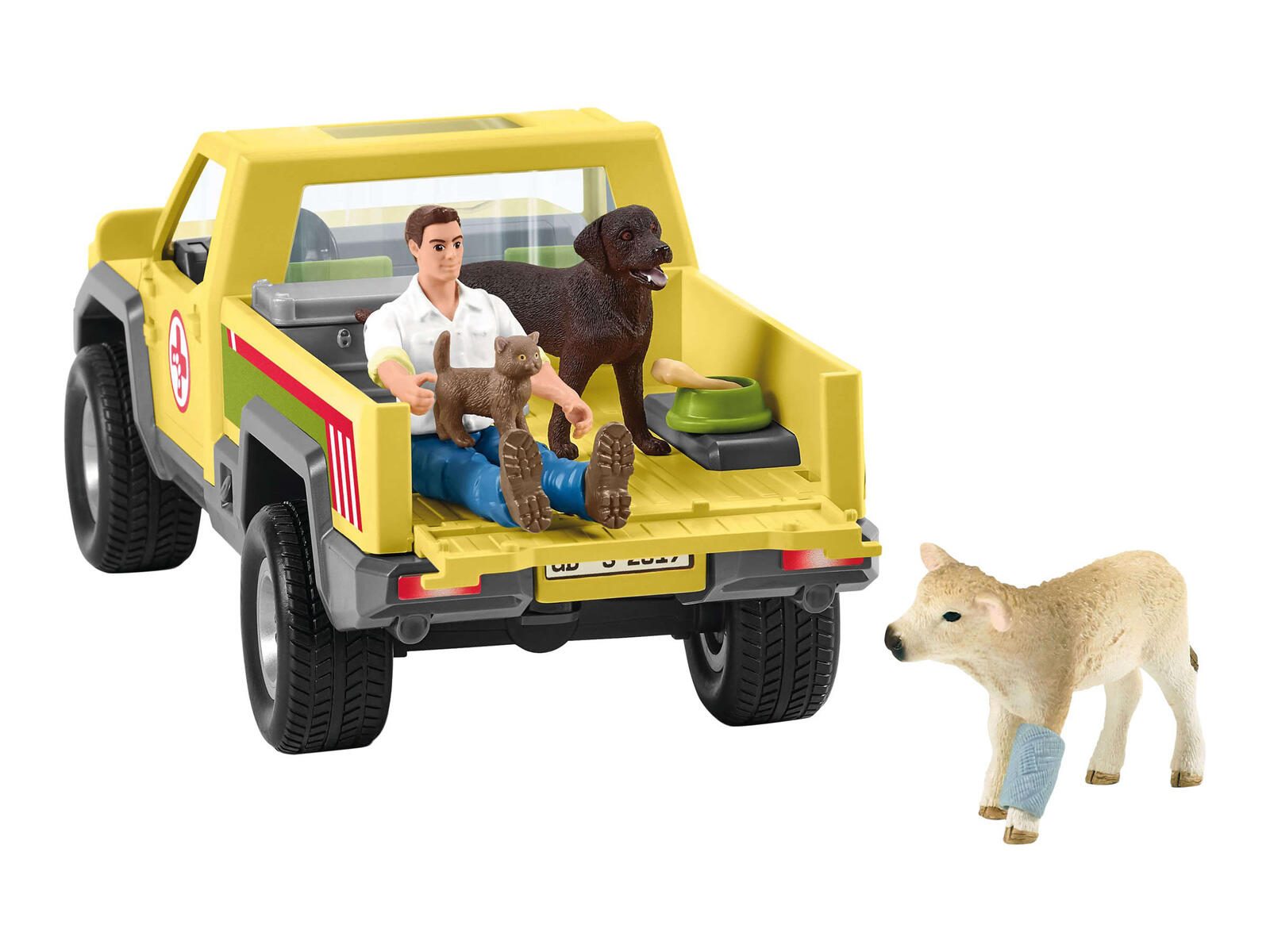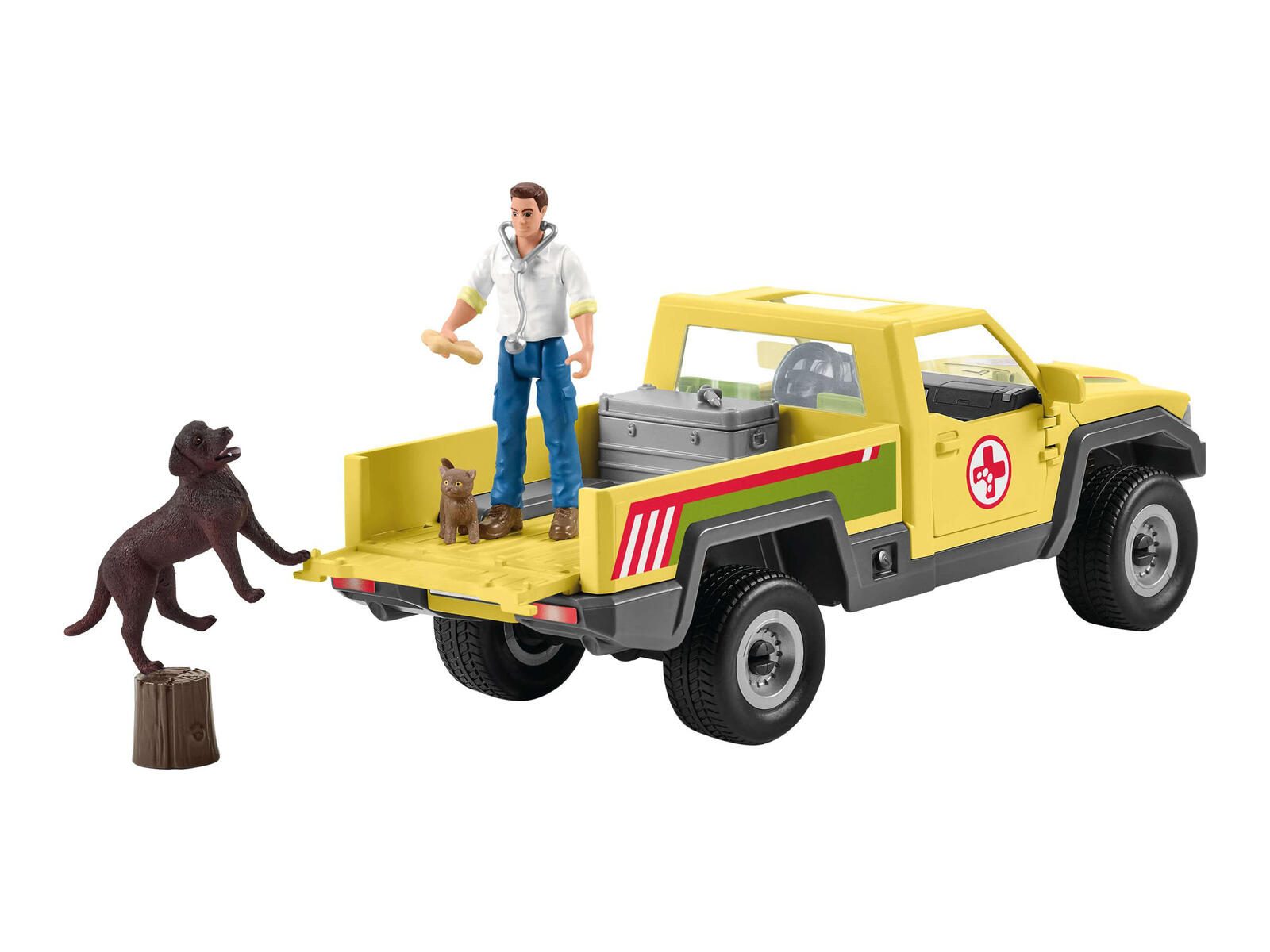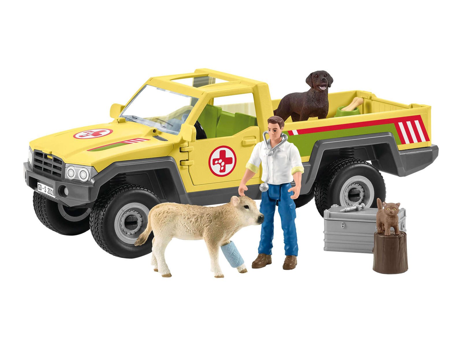 - Lieferung inkl.: Kälbchen, Hündin, Kätzchen, Alukiste, Stethoskop, Bandage, Napf, Knochen, Baumstamm, Stickerbogen