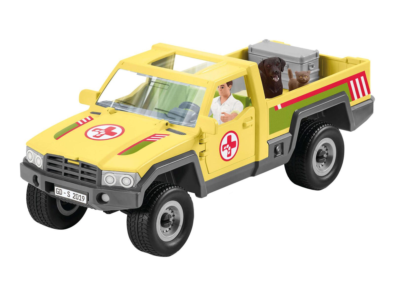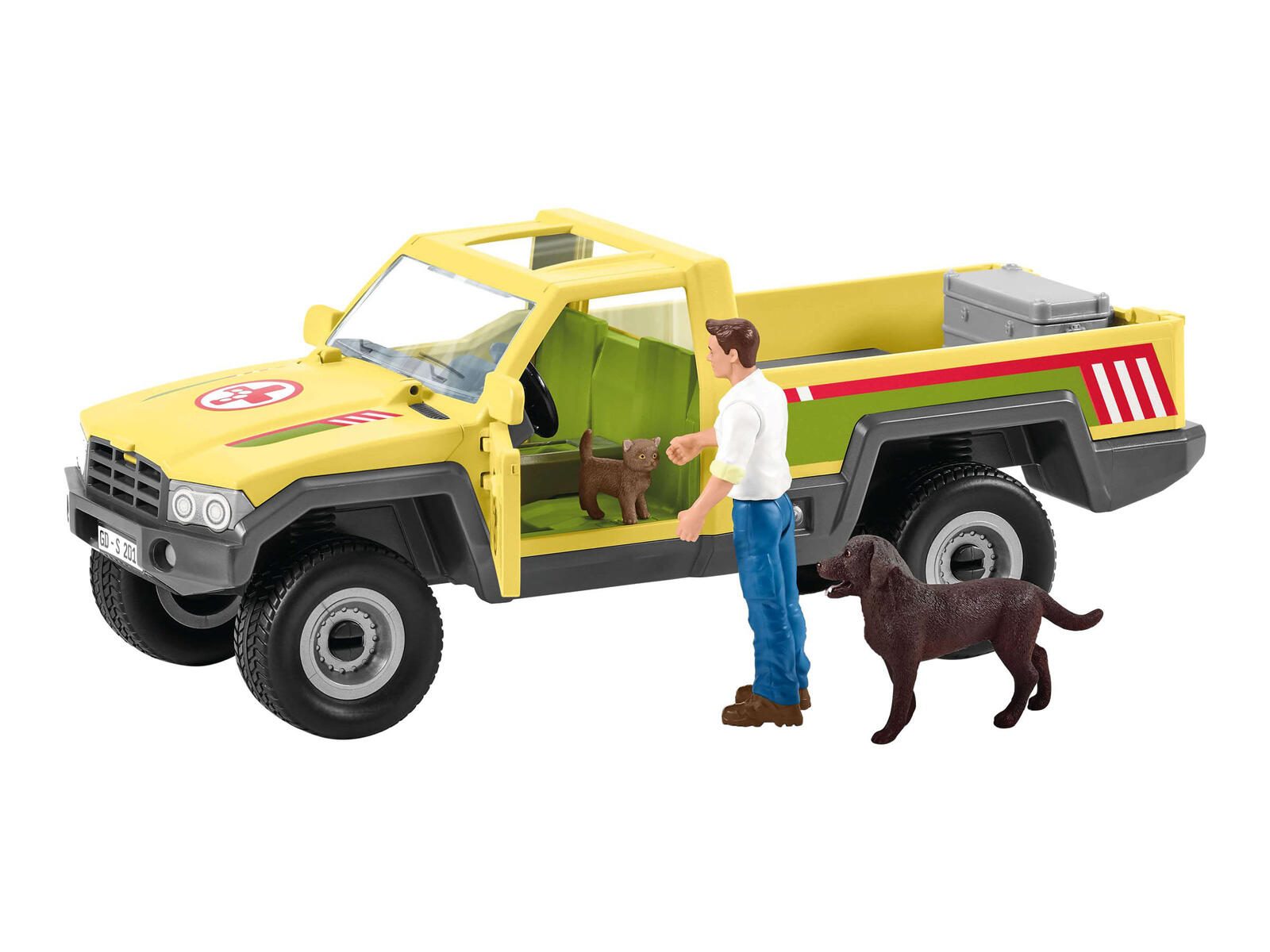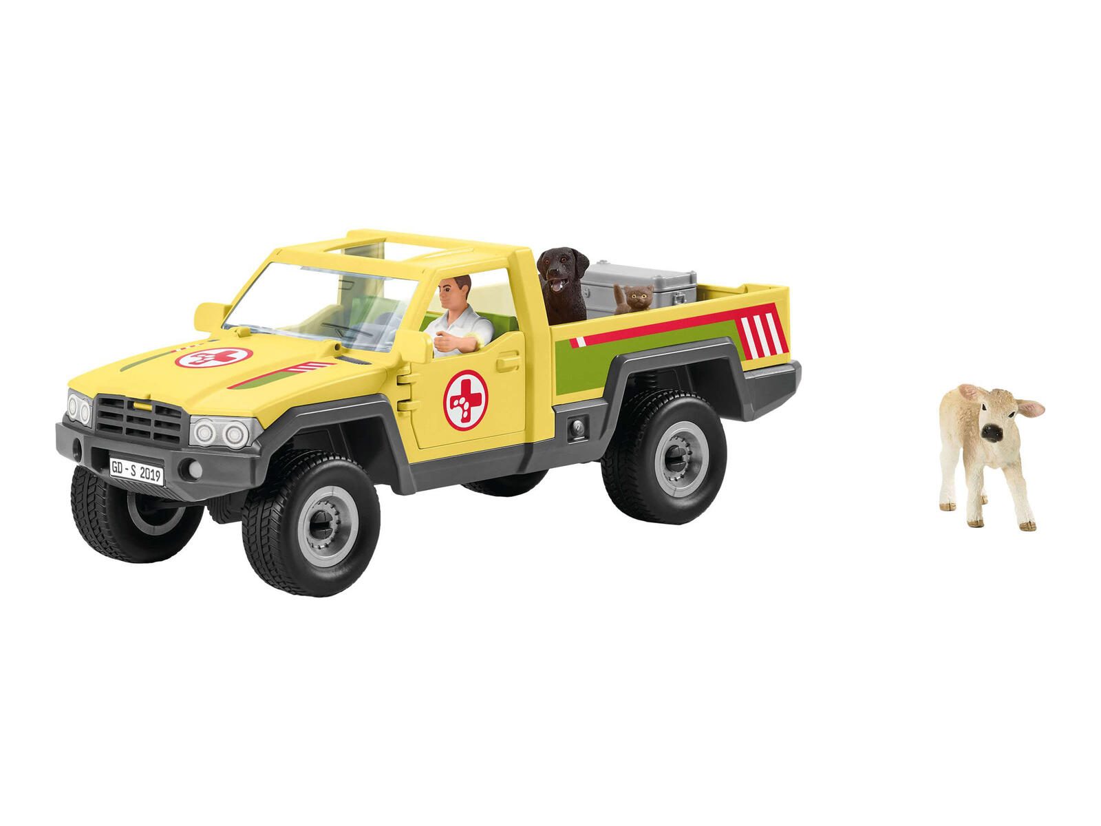 - Lieferung inkl.: Kälbchen, Hündin, Kätzchen, Alukiste, Stethoskop, Bandage, Napf, Knochen, Baumstamm, Stickerbogen