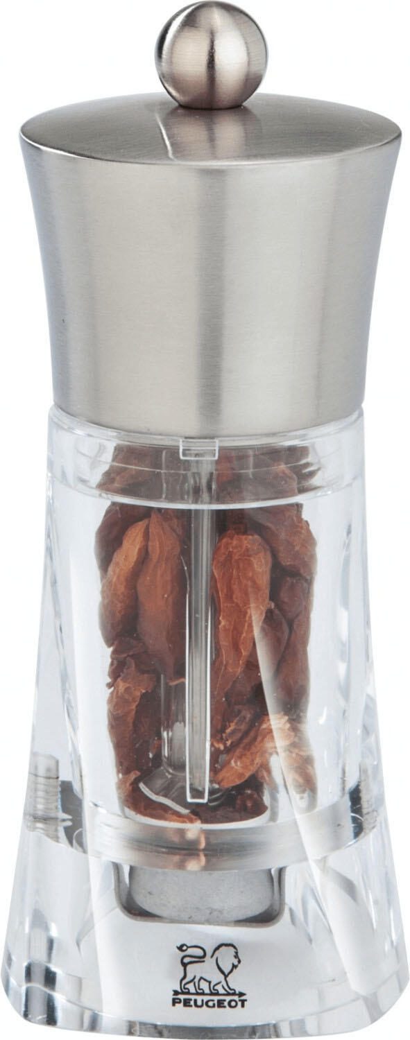 Die PEUGEOT Ouessant Chilimühle in transparent/silber ist ein elegantes und funktionales Küchenutensil, das jedem Kochliebhaber Freude bereitet. Mit ihrem modernen Design aus hochwertigem Acryl und Edelstahl fügt sich diese Gewürzmühle nahtlos in jede Kücheneinrichtung ein und hebt die Ästhetik deiner Kochumgebung hervor. Die transparente Oberfläche ermöglicht es dir, den Inhalt der Mühle jederzeit im Blick zu behalten, während das silberne Edelstahl-Element einen Hauch von Eleganz verleiht. Diese Kombination aus Materialien sorgt nicht nur für eine ansprechende Optik, sondern garantiert auch Langlebigkeit und Widerstandsfähigkeit. Die PEUGEOT Ouessant Chilimühle ist mit einer speziellen Mechanik ausgestattet, die ein gleichmäßiges Mahlen deiner Gewürze ermöglicht. So kannst du die Aromen von frischen Chilischoten optimal entfalten und deine Gerichte mit einem unverwechselbaren Geschmack verfeinern. Mit einer Höhe von 14 cm ist diese Mühle handlich und leicht zu bedienen. Sie liegt gut in der Hand und ermöglicht dir eine präzise Dosierung der Gewürze, sodass du immer die perfekte Menge für deine kulinarischen Kreationen verwenden kannst. Die PEUGEOT Ouessant Chilimühle ist nicht nur ein praktisches Werkzeug in der Küche, sondern auch ein stilvolles Accessoire, das den Esstisch aufwertet. Ob für den täglichen Gebrauch oder für besondere Anlässe, diese Chilimühle ist ein unverzichtbarer Begleiter für alle, die das Kochen lieben. Sie eignet sich hervorragend für die Zubereitung von scharfen Gerichten und verleiht jedem Gericht das gewisse Etwas. Entdecke die Vorzüge der PEUGEOT Ouessant Chilimühle und genieße ein neues Level des Kochens.Technische Daten