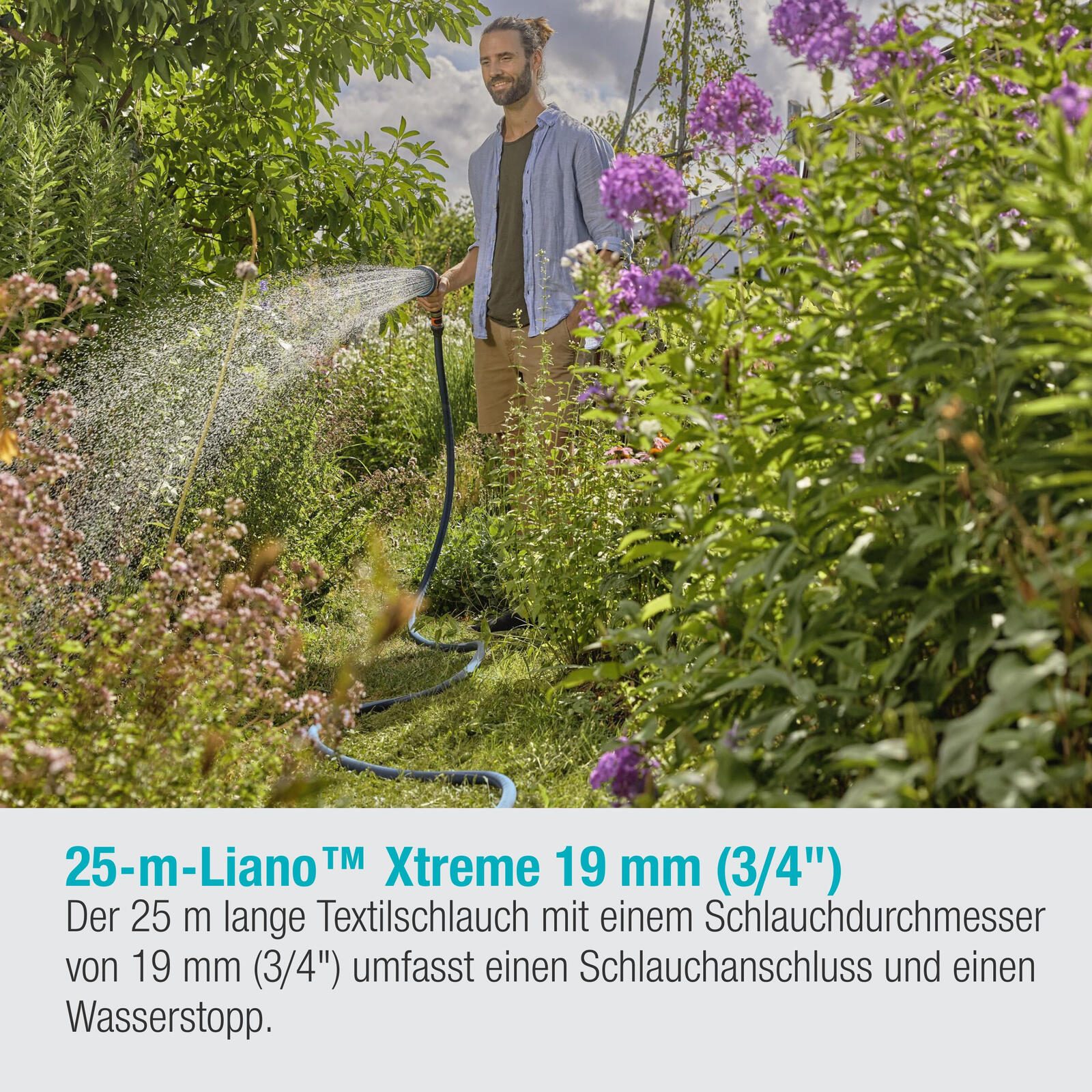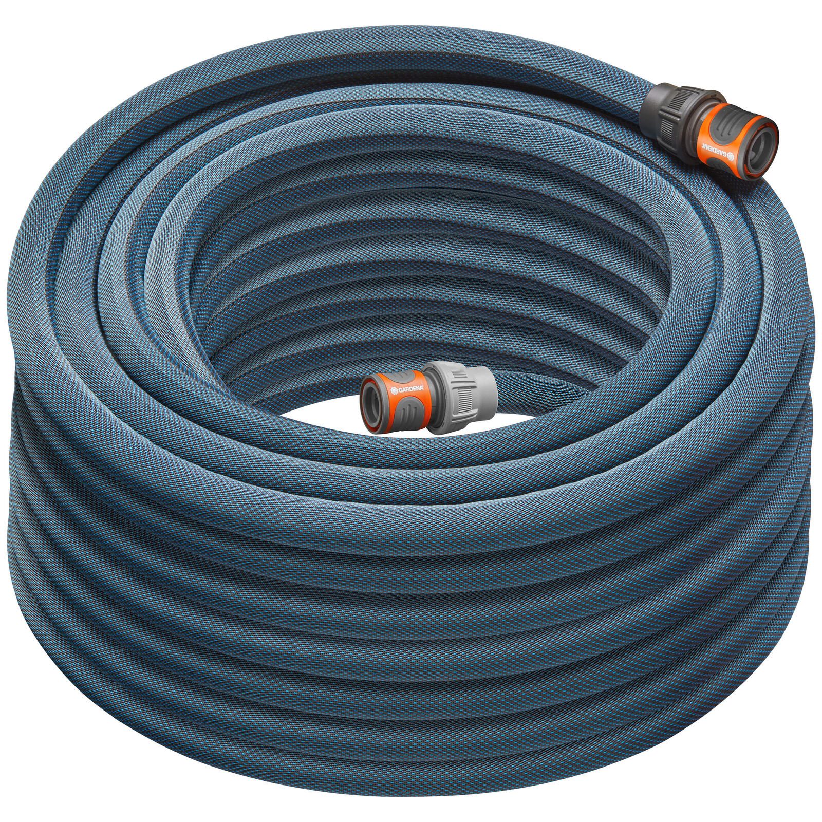Der Schlauch des Sets besteht aus strapazierfähigem Textilgewebe, das für Langlebigkeit und Zuverlässigkeit sorgt. Die blau gefärbte Textur verleiht dem Schlauch zudem eine ansprechende Optik, die sich nahtlos in deinen Garten einfügt.