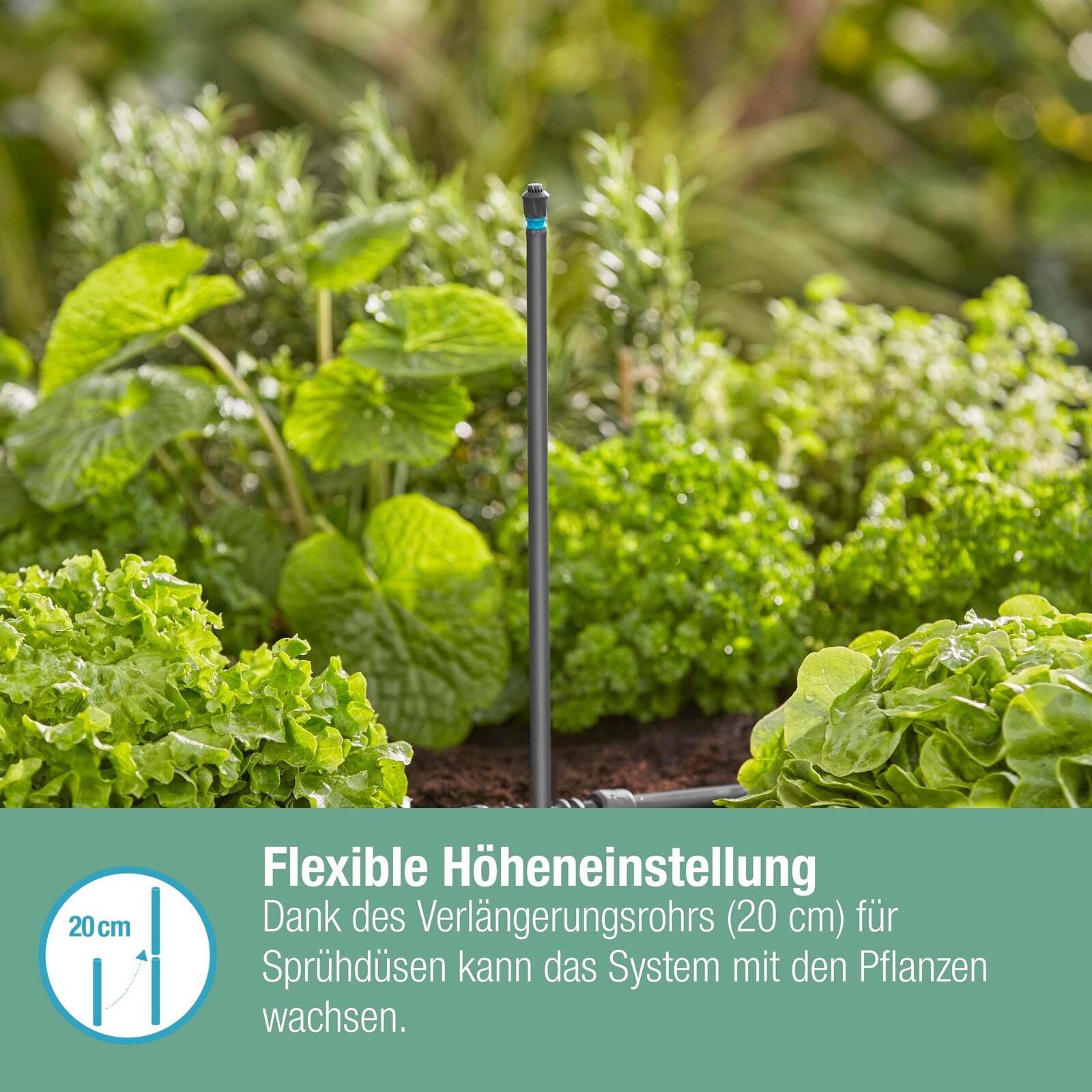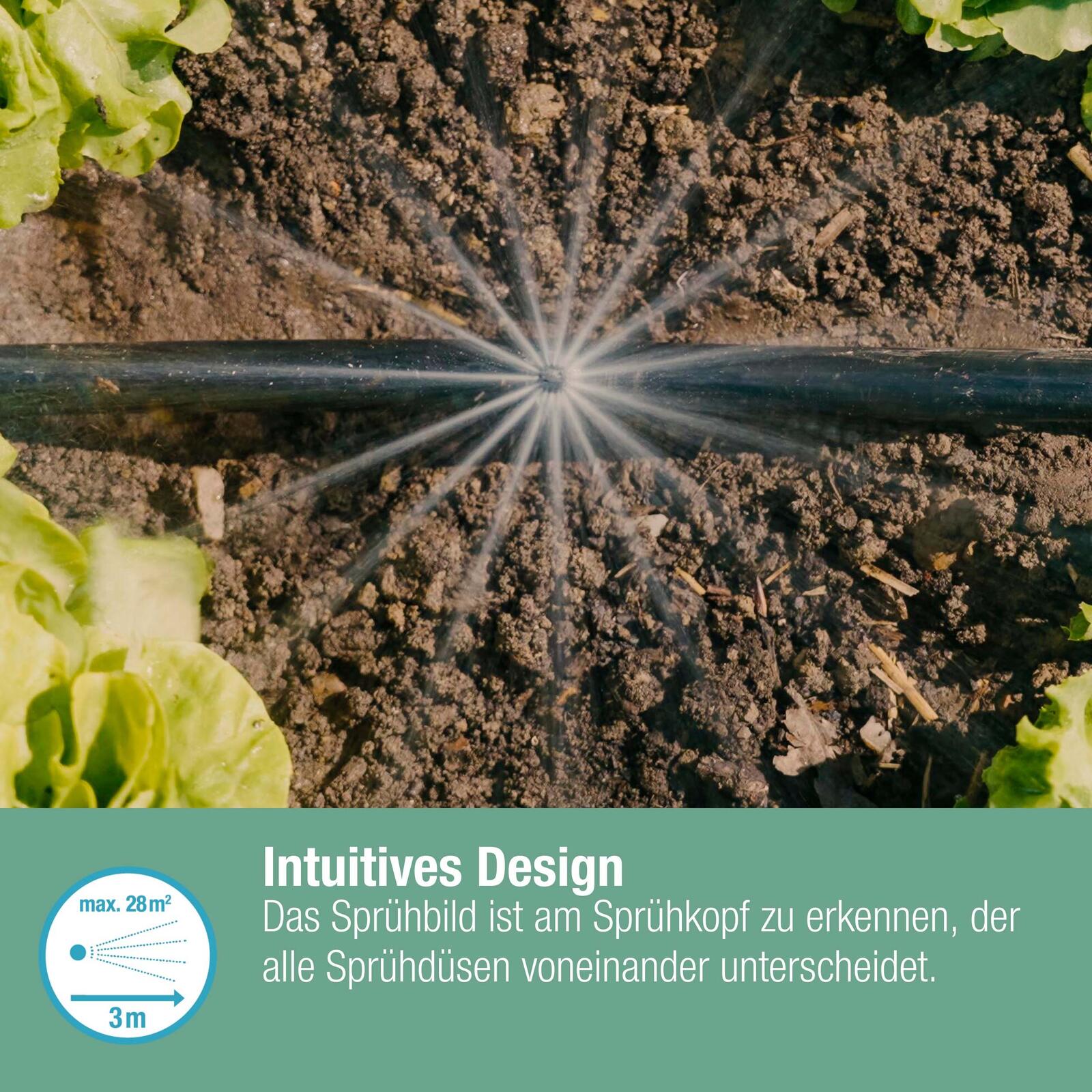 Die GARDENA Düse für Tropfschlauch Micro-Grip-System 360° ist die ideale Lösung für eine präzise und gleichmäßige Bewässerung deiner Pflanzen. Mit einem Gesamtinhalt von fünf Sprühdüsen, die einen 360°-Sprühwinkel bieten, kannst du sicherstellen, dass jede Pflanze in deinem Garten optimal mit Wasser versorgt wird. Hergestellt aus hochwertigem Kunststoff in ansprechenden Farben Schwarz und Orange, vereint diese Düse Funktionalität mit einem modernen Design. Sie ist speziell geeignet für die Verwendung mit dem Verlegerohr Flex 13 mm (1/2") sowie dem T-Stück für Sprühdüsen, was die Installation und Anpassung an bestehende Systeme erleichtert. Das Montagewerkzeug (Art.-Nr. 13313) ermöglicht eine einfache Handhabung, sodass du die Düsen schnell und unkompliziert anbringen kannst. Ein weiteres herausragendes Merkmal der GARDENA Düse ist die Möglichkeit, die Sprühweite mithilfe des Regulierventils (Art.-Nr. 13231) zu regulieren. Diese Funktion erlaubt es dir, die Bewässerung individuell anzupassen, je nach den spezifischen Bedürfnissen deiner Pflanzen und der jeweiligen Witterung. Mit der GARDENA Düse für Tropfschlauch Micro-Grip-System 360° kannst du die Effizienz deiner Bewässerung maximieren und gleichzeitig den Wasserverbrauch minimieren. Die Kombination aus einfacher Installation, flexibler Anwendung und hochwertiger Verarbeitung macht diese Düse zu einem unverzichtbaren Zubehör für jeden Gartenliebhaber, der Wert auf eine nachhaltige und effektive Bewässerung legt.Technische Daten