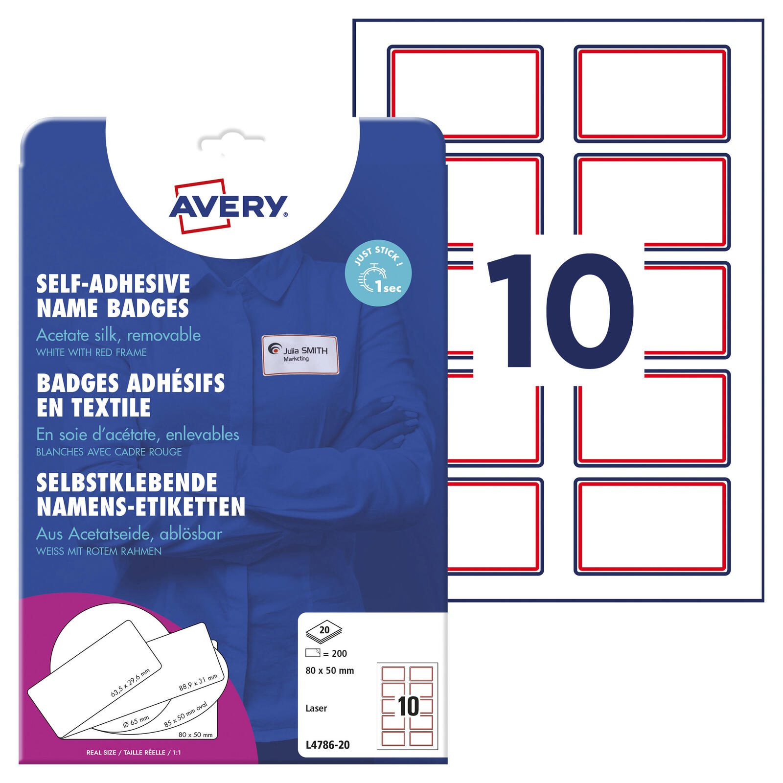 Die AVERY Zweckform Namensetiketten L4786-20 in der Farbe weiß sind die ideale Lösung für all deine Beschriftungsbedürfnisse. Mit einer praktischen Größe von 80,0 x 50,0 mm bieten diese rechteckigen Etiketten ausreichend Platz für Namen, Texte oder andere wichtige Informationen. Jedes Pack enthält 200 Etiketten, die auf 20 A4-Bögen angeordnet sind, was eine einfache Handhabung und eine hohe Effizienz beim Drucken ermöglicht. Hergestellt aus hochwertiger Acetatseide, überzeugen diese Etiketten nicht nur durch ihre ansprechende Optik, sondern auch durch ihre Funktionalität. Die glänzende Oberfläche verleiht den Etiketten ein professionelles Aussehen, während die abgerundeten Ecken ein ansprechendes Design bieten und das Abblättern verhindern. Die Etiketten sind selbstklebend und lassen sich problemlos auf verschiedenen Oberflächen anbringen. Zudem sind sie leicht ablösbar, was sie besonders benutzerfreundlich macht. Die AVERY Zweckform Namensetiketten sind mit SW-Laserdruckern bedruckbar, sodass du die Etiketten ganz nach deinen Wünschen gestalten kannst. Sie sind chlorfrei gebleicht und somit umweltfreundlich, was sie zu einer verantwortungsbewussten Wahl für die nachhaltige Beschriftung macht. Darüber hinaus sind sie lösemittelfrei und holzfrei, was die Qualität und Sicherheit der Etiketten erhöht. Egal, ob du sie für Veranstaltungen, Büroanwendungen oder private Zwecke benötigst, die AVERY Zweckform Namensetiketten bieten dir die Flexibilität, die du brauchst. Ihre blickdichte Beschaffenheit sorgt dafür, dass der Untergrund nicht durchscheint, was die Lesbarkeit deiner Beschriftungen verbessert. Vertraue auf die Qualität von AVERY Zweckform und bringe deine Beschriftungen auf das nächste Level.Technische Daten