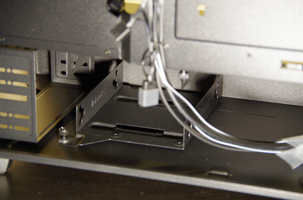 Für SSD ist ein Doppelträger auf der Rückseite vorgesehen, der analog zu den HDD Trägern installiert wird. Dieser kann alternativ auch auf der Vorderseite auf der Netzteilabdeckung installiert werden.