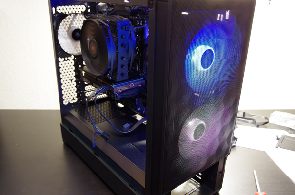 An dem Gehäuse mag ich besonders, das hochwertige Material, also den Verzicht auf Kunststoffbauteile und das schöne modernes Design. Besonders die geformte Mesh-Struktur an der Front sticht ins Auge und sorgt für gute Kühlung der Hardware. Das Gehäuse wird durch die bunt beleuchteten Gehäuselüfter effektvoll in Szene gesetzt und lässt sich über den RGB-Controller einfach steuern. Die Beleuchtung ist direkt einsatzbereit und muss nicht über eine Software installiert werden. Positiv hervorzuheben sind außerdem die zahlreichen Möglichkeiten zur Unterbringung von Laufwerken.