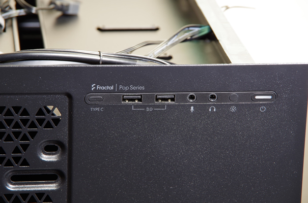 Zur Ausstattung des Panels gehört neben dem Einschaltknopf ein Knopf für die Steuerung der RGB Lüfter, je eine Kopfhörer- und Mikrofonbuchse, sowie 2 USB 3.0 Steckplätze. Ein USB Typ C Steckplatz ist vorbereitet, muss allerdings extra gekauft werden.