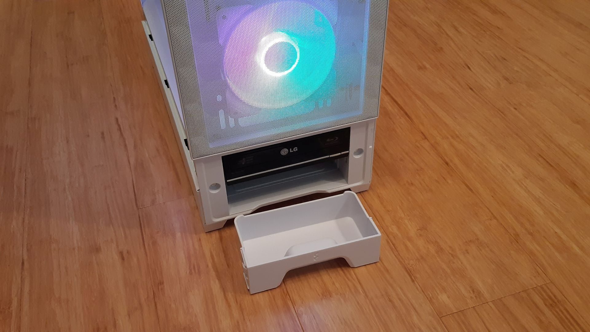 Besonders gut an dem Gehäuse gefällt mir das kleine verborgene Areal unter der Front-Mesh-Struktur. Hinter einer magnetisch haftenden Abdeckung bietet das Gehäuse hier Platz für bis zu zwei 5,25“ Einschübe. Hier konnte ich meinen Blu-Ray-Brenner unterbringen. Den zweiten Slot nimmt die ebenfalls mitgelieferte Schublade ein, hier kann ich endlich meine USB-Sticks zuverlässig unterbringen, die gelegentlich für Installationen oder zum Daten-Austausch benötigt werden