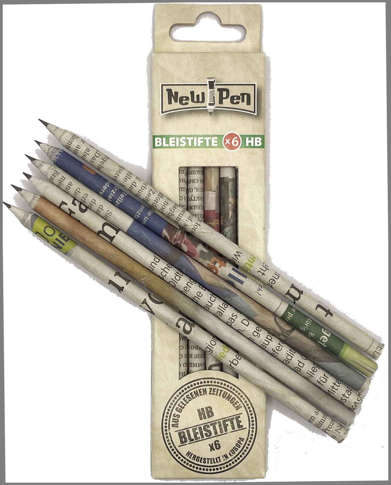 Das NewPen Bleistift-Set in Zeitungsoptik umfasst sechs runde Bleistifte mit einem Härtegrad von HB. Diese Stifte zeichnen sich durch ihr ansprechendes Design aus, das an klassische Zeitungen erinnert und somit einen besonderen Vintage-Charakter verleiht. Die Schaftfarbe in Zeitungsoptik macht jedes Schreibgerät zu einem stilvollen Begleiter für Schule, Büro oder kreative Projekte.