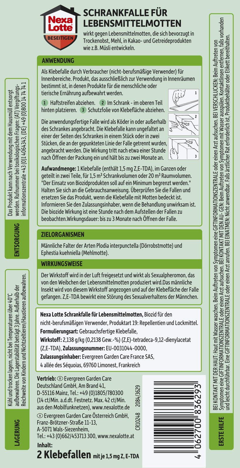 Die Falle ist in einem braunen Farbton gehalten und wird im Zweierpack geliefert. Sie gehört zur Serie „Lebensmittel“ und ist ein praktisches Haushaltsutensil zur Vorbeugung und Bekämpfung von Lebensmittelmottenbefall. Hersteller des Produkts ist die Evergreen Garden Care Deutschland GmbH mit Sitz in Mainz.