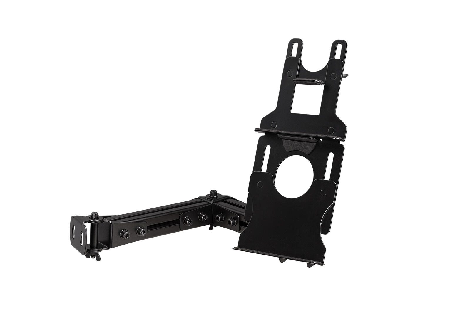 Das Elite Tablet / Button Box Add-on wurde entwickelt und konstruiert, um Ihnen die Möglichkeit zu geben, Ihr Tablet oder Ihre Button Box in der perfekten Position zu montieren. Mit einer doppelt verbundenen Konfiguration ist der Benutzer in der Lage, volle Einstellbarkeit in Entfernung und Platzierung ihrer Button-Box zu haben. Mit mehreren Einrichtungskonfigurationen kann der Benutzer mit einer einzigen Armkombination eine perfekte Integration erreichen. Das Elite Tablet/ Button Box Add-on bietet außerdem drei seitliche Drehachsen für eine einfache Bewegung und für die Feineinstellung von Abstand und Winkel. Die vertikale Drehachse ermöglicht es dem Benutzer, seine Button-Box oder sein Tablet in die optimale Position zu bringen. Die Halterungsklemmen bieten einen Verstellbereich von 105 Grad (90 Grad Neigung nach oben und 15 Grad Neigung nach unten). Die Halterungsarme lassen sich um 160 Grad verstellen (80 Grad im und 80 Grad gegen den Uhrzeigersinn). Bei der Radplattenbefestigung beträgt die Winkeleinstellung 120 Grad (60 Grad im Uhrzeigersinn und 60 Grad gegen den Uhrzeigersinn), während der Schwenkwinkel 140 Grad beträgt (90 Grad Neigung nach oben und 50 Grad Neigung nach unten).