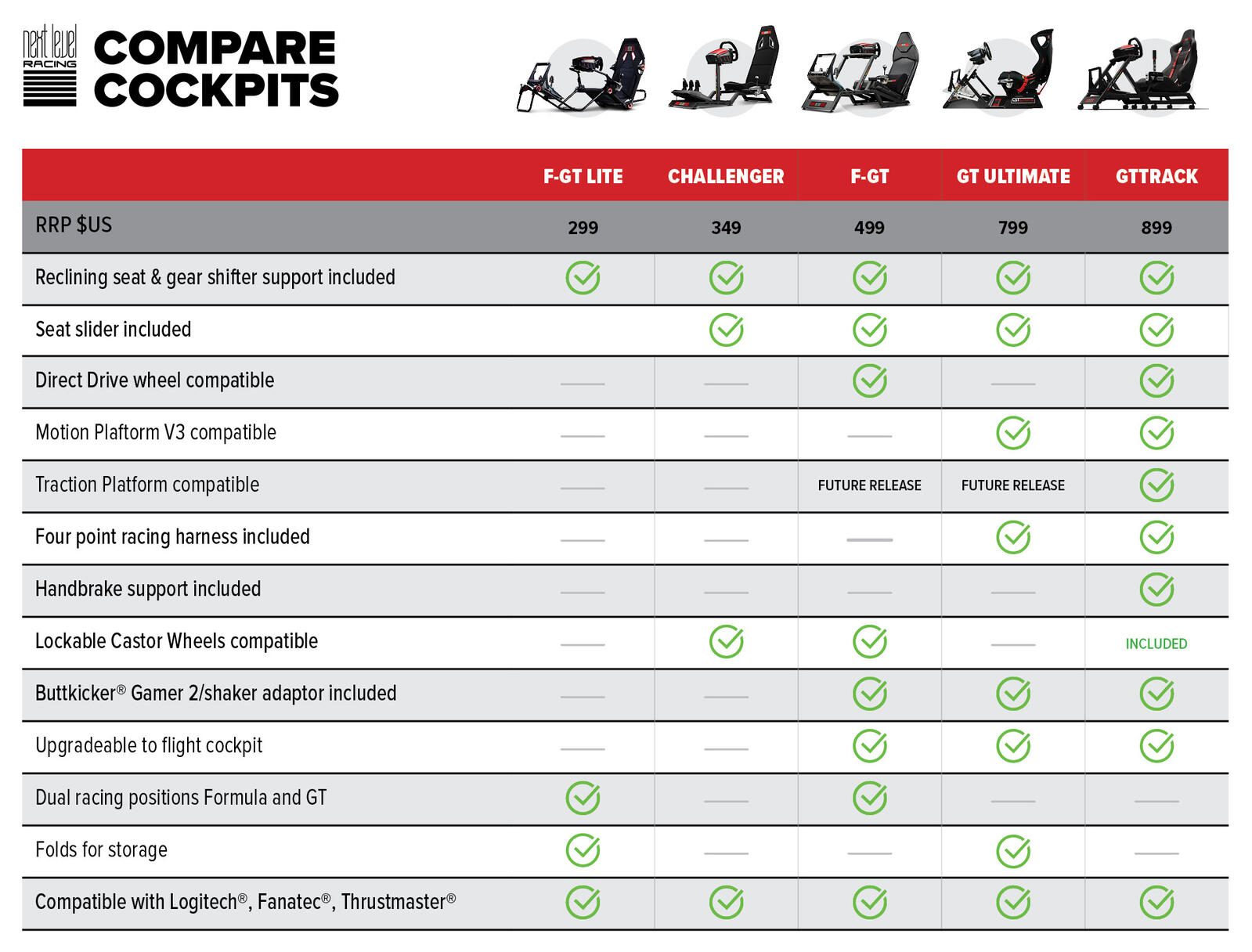 Extras wie Schalthebelunterstützung, Sitzgleiter, Lendenwirbelstütze, höhenverstellbare Füße und der Buttkicker® Gamer 2-Adapter gehören zum Lieferumfang des Next Level Racing® F-GT und machen es zum günstigsten Cockpit auf dem Markt.