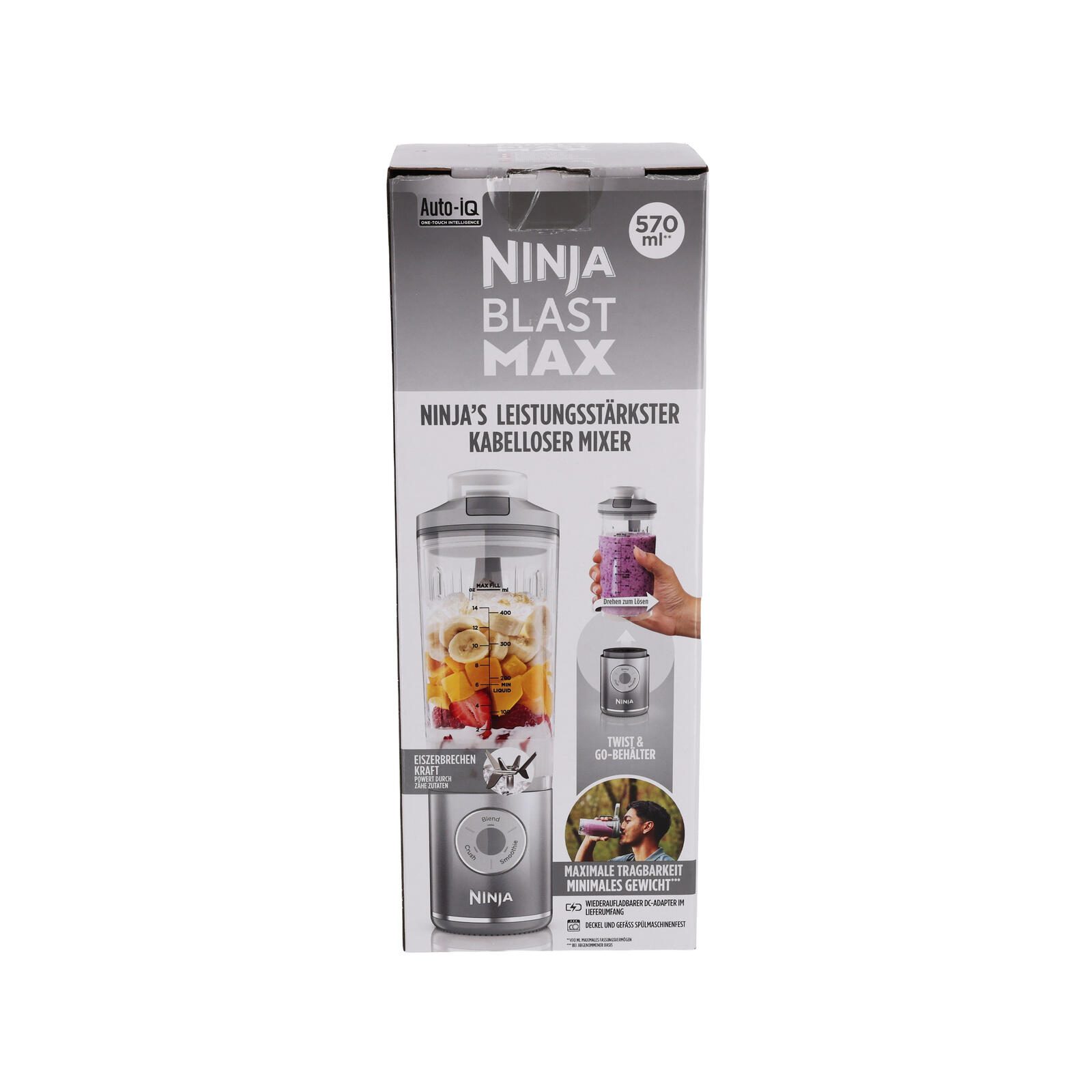 Im Lieferumfang enthalten: Blast Max Motorbasis, 570 ml* Mixbecher mit integrierter CrushBlade, auslaufsicherem Deckel mit Trinköffnung, Ladekabel und Rezeptheft.