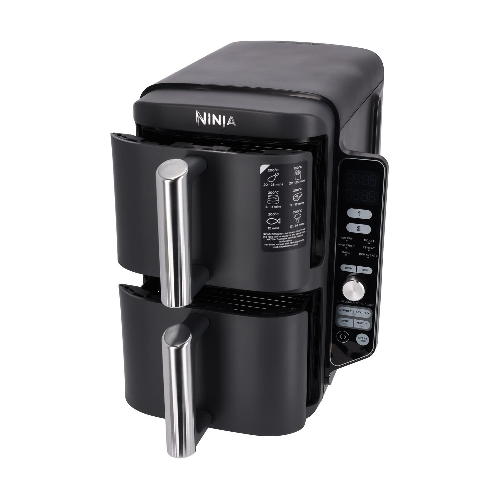 Doppeltes Fassungsvermögen** mit Double Stack Heißluftfritteusen Technologie: Kochen Sie auf 4 Ebenen gleichzeitig für gleichmäßig knusprige Ergebnisse. Setzen Sie einfach die mitgelieferten Double Stack-Grillroste in jede Schublade ein, um die Kochfläche zu verdoppeln.