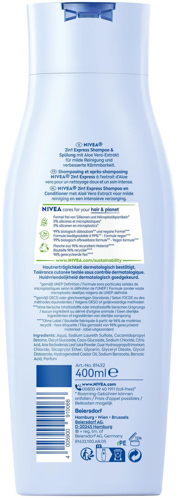 Das NIVEA 2 IN 1 EXPRESS Shampoo & Spülung vereint Reinigung und Pflege in einem Produkt und bietet eine schnelle, effektive Lösung für die tägliche Haarpflege. Speziell entwickelt für Frauen und Männer, stärkt es die Haarstruktur und erhöht die Widerstandsfähigkeit des Haares spürbar. Die einzigartige Formel mit natürlichem Aloe Vera Extrakt sorgt für sanfte Reinigung der Kopfhaut und verleiht dem Haar einen natürlichen, gesunden Glanz.