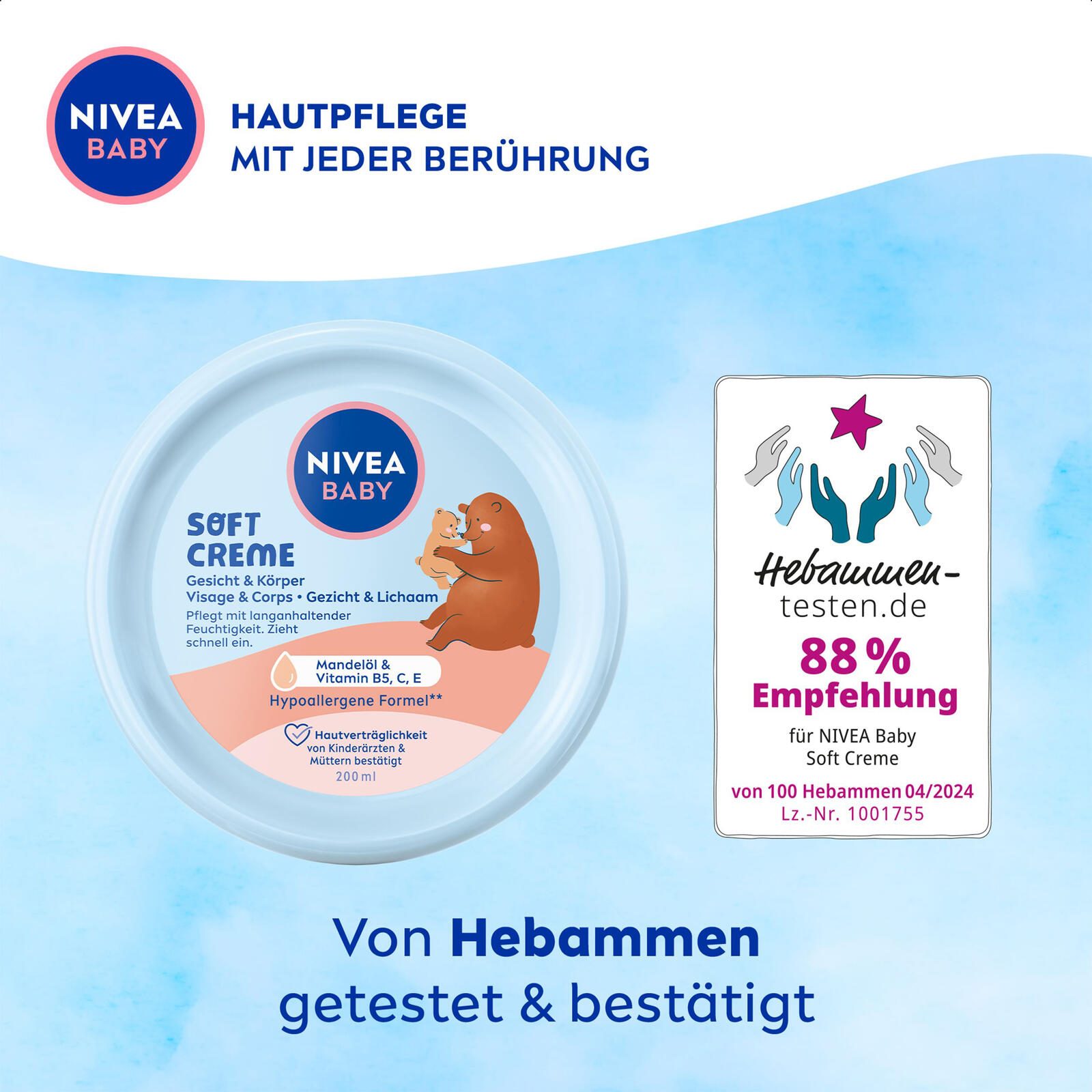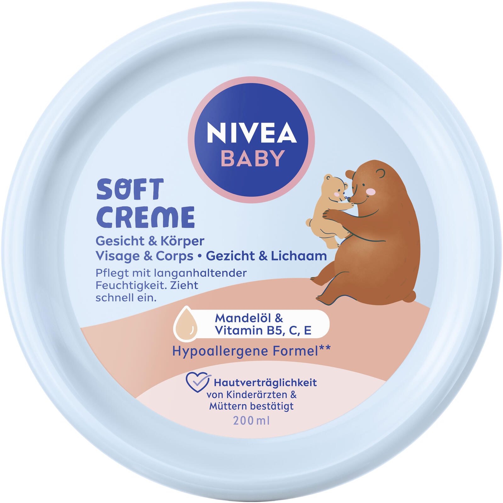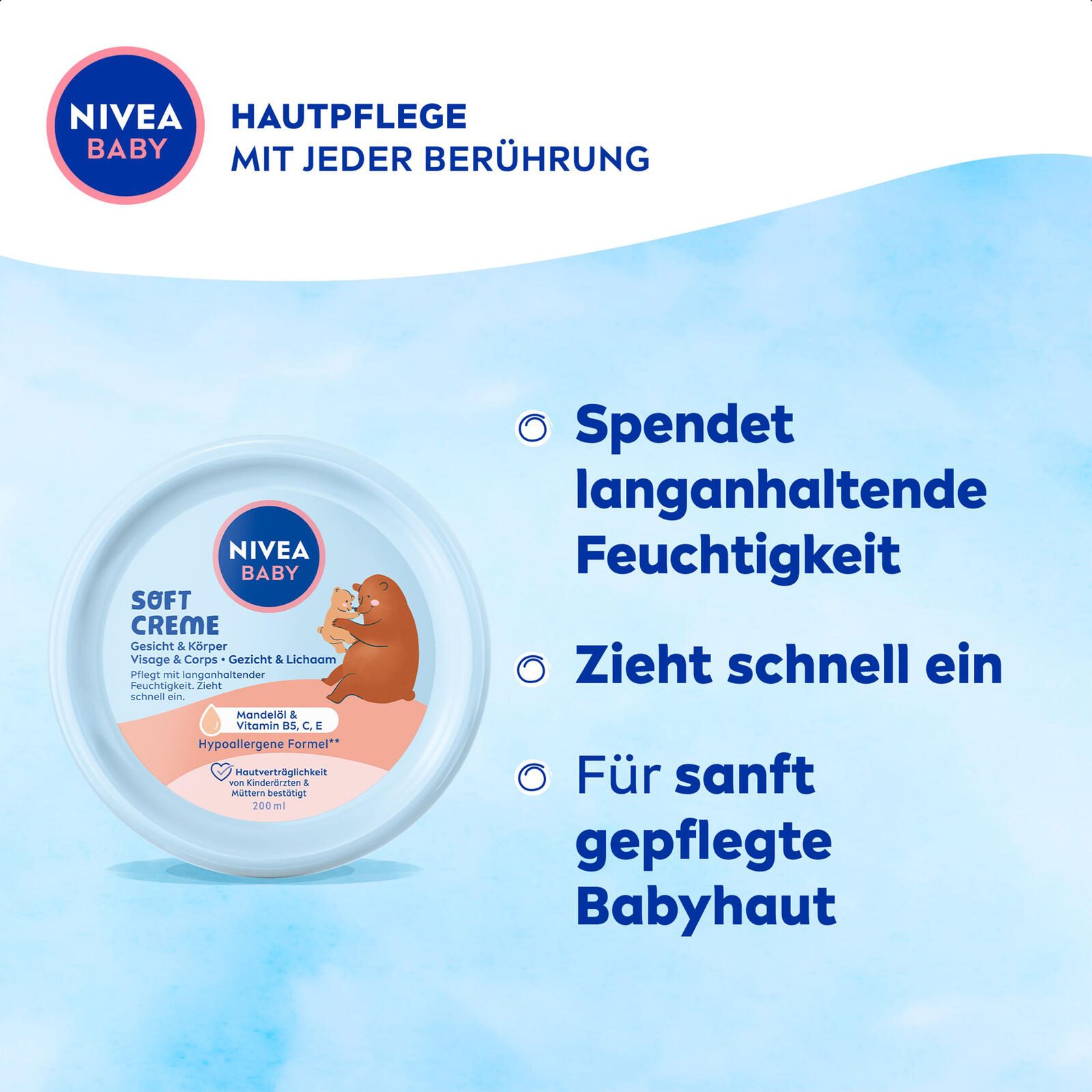 Die NIVEA BABY SOFT Babycreme ist speziell für die zarte und empfindliche Haut von Babys entwickelt worden. Mit einer hypoallergenen Formel bietet sie eine besonders sanfte Pflege, die auch von Kinderärzten und Müttern empfohlen wird. Die Creme pflegt die Haut mit langanhaltender Feuchtigkeit und zieht dabei schnell ein, sodass keine unangenehmen Rückstände bleiben.