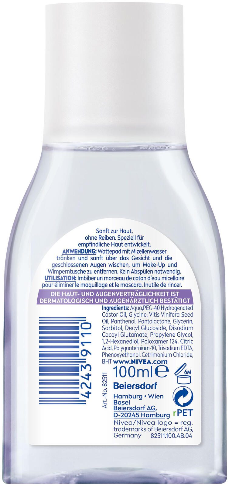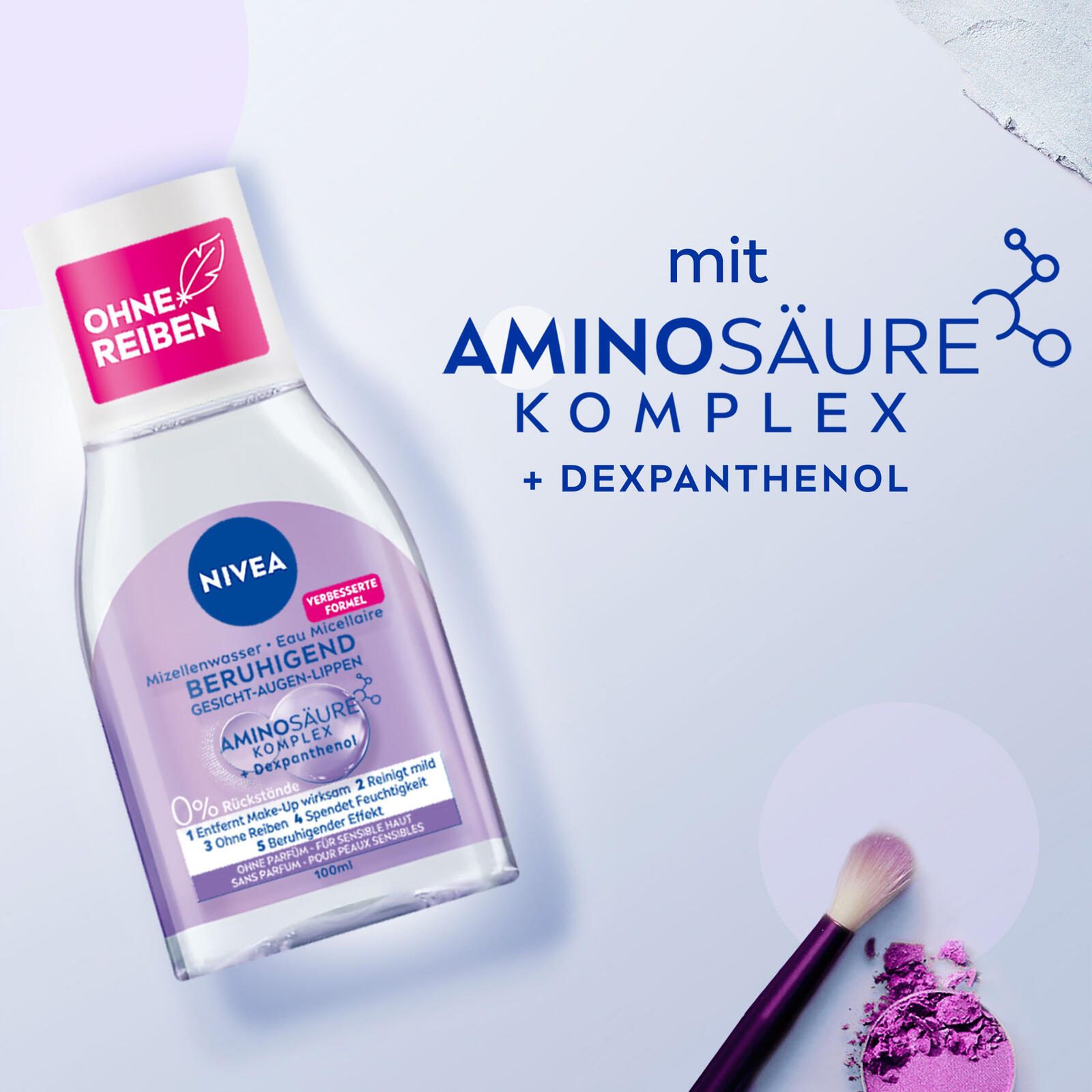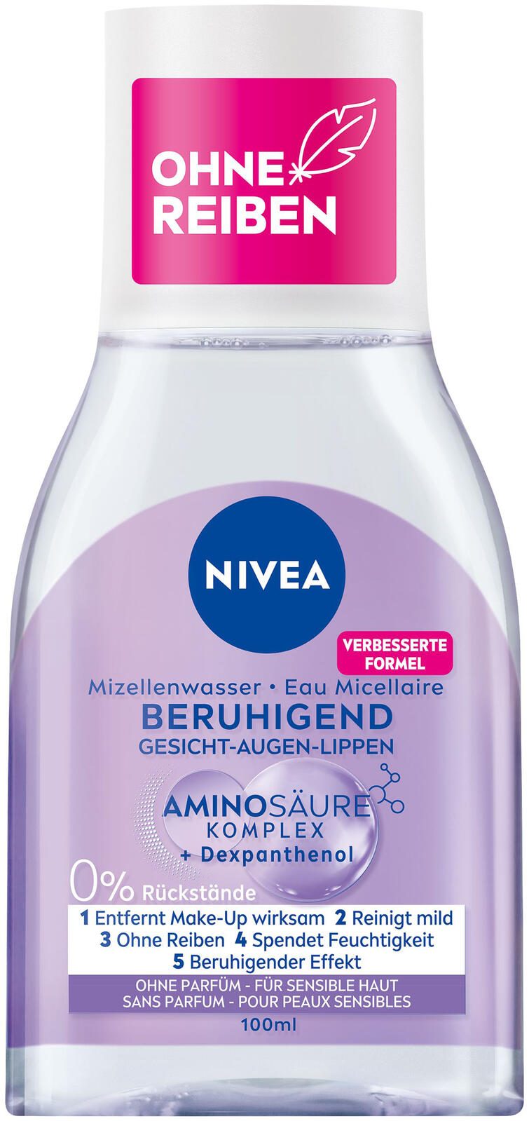 - Beruhigende Formel mit Aminosäurekomplex und Dexpanthenol. Angereichert mit reinigenden Mizellen und sanften Aminosäuren. NIVEA Mizellenwasser ist parfümfrei und dermatologisch und augenärztlich getestet, so dass es für Gesicht, Augen und Lippen verwendet