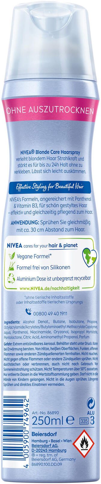 - Verleiht blondem Haar Strahlkraft für bis zu 24h Halt. Trocknet das Haar nicht aus. Lässt sich leicht auskämmen. Stärkt & schützt das Haar. Mit Panthenol & Vitamin B3. Die Formel ist vegan & frei von Silikonen. Aluminium Dose ist unbegrenzt recycelbar.