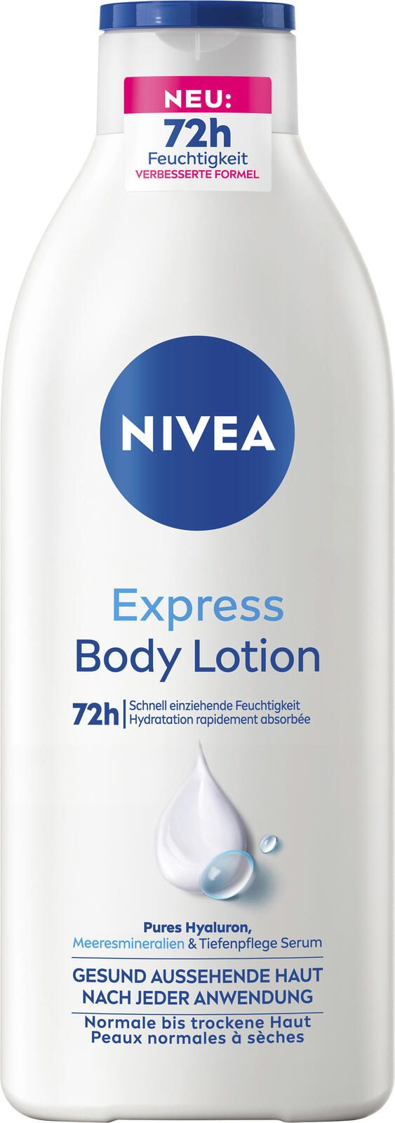 Die NIVEA Bodylotion EXPRESS 400 ml ist eine pflegende Lotion, die speziell für normale und trockene Haut entwickelt wurde. Sie zieht schnell ein und versorgt die Haut mit Feuchtigkeit für bis zu 72 Stunden. Damit eignet sie sich ideal für die tägliche Anwendung, wenn eine schnelle und effektive Pflege gewünscht wird.