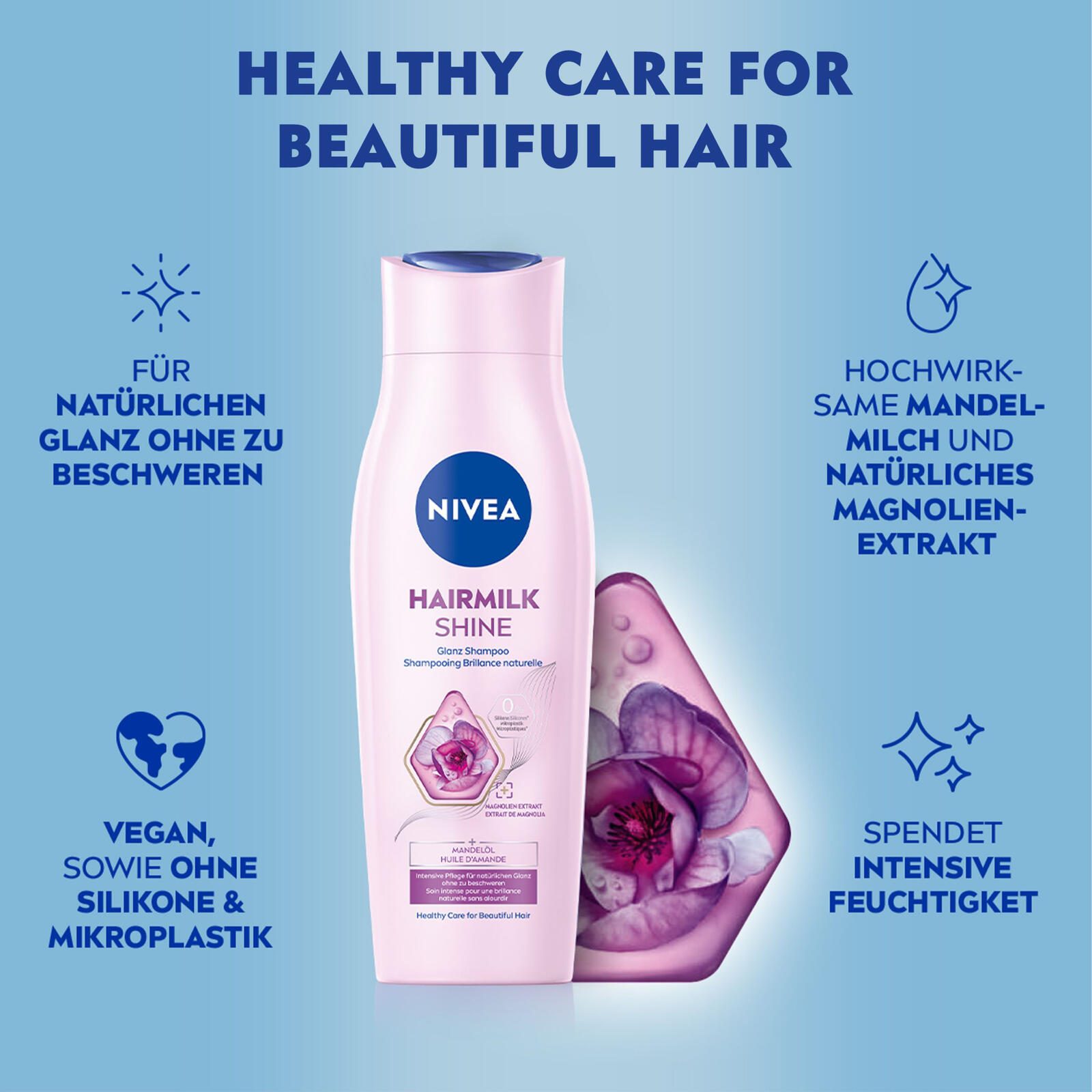Das NIVEA HAIRMILK SHINE Shampoo vereint sanfte Reinigung mit intensiver Pflege und ist speziell für Frauen und Männer entwickelt. Die einzigartige Formel mit hochwirksamer Mandelmilch und natürlichem Magnolien-Extrakt regeneriert das Haar von innen heraus, wodurch es sichtbar gepflegt und spürbar gesund wird. Dieses Shampoo verleiht dem Haar einen natürlichen, extra Glanz und sorgt für eine geglättete Haarstruktur, die sich weich und geschmeidig anfühlt.