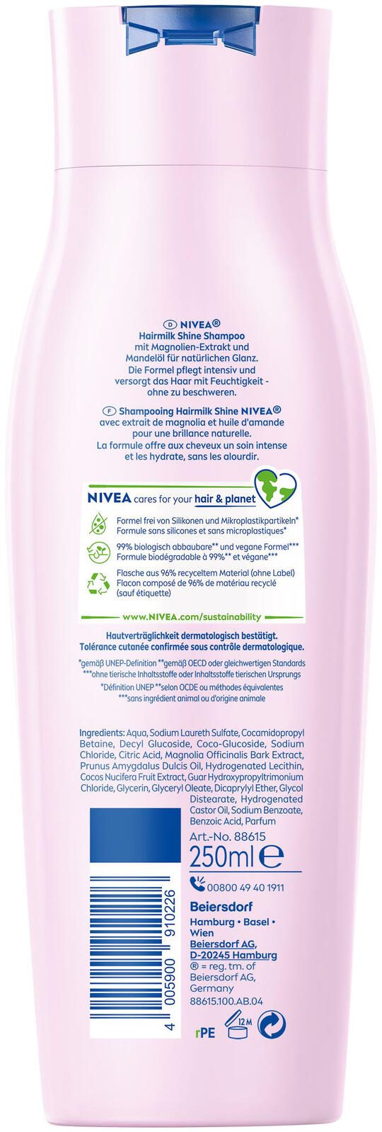 Mit einem Inhalt von 250 ml bietet das NIVEA HAIRMILK SHINE Shampoo eine ausgewogene Menge für regelmäßige Haarpflege. Es eignet sich hervorragend für alle Haartypen, die Wert auf Glanz, Geschmeidigkeit und eine gesunde Haarstruktur legen. Die Kombination aus hochwertigen Inhaltsstoffen und sanfter Reinigung macht dieses Shampoo zu einer ausgezeichneten Wahl für die tägliche Haarpflege.