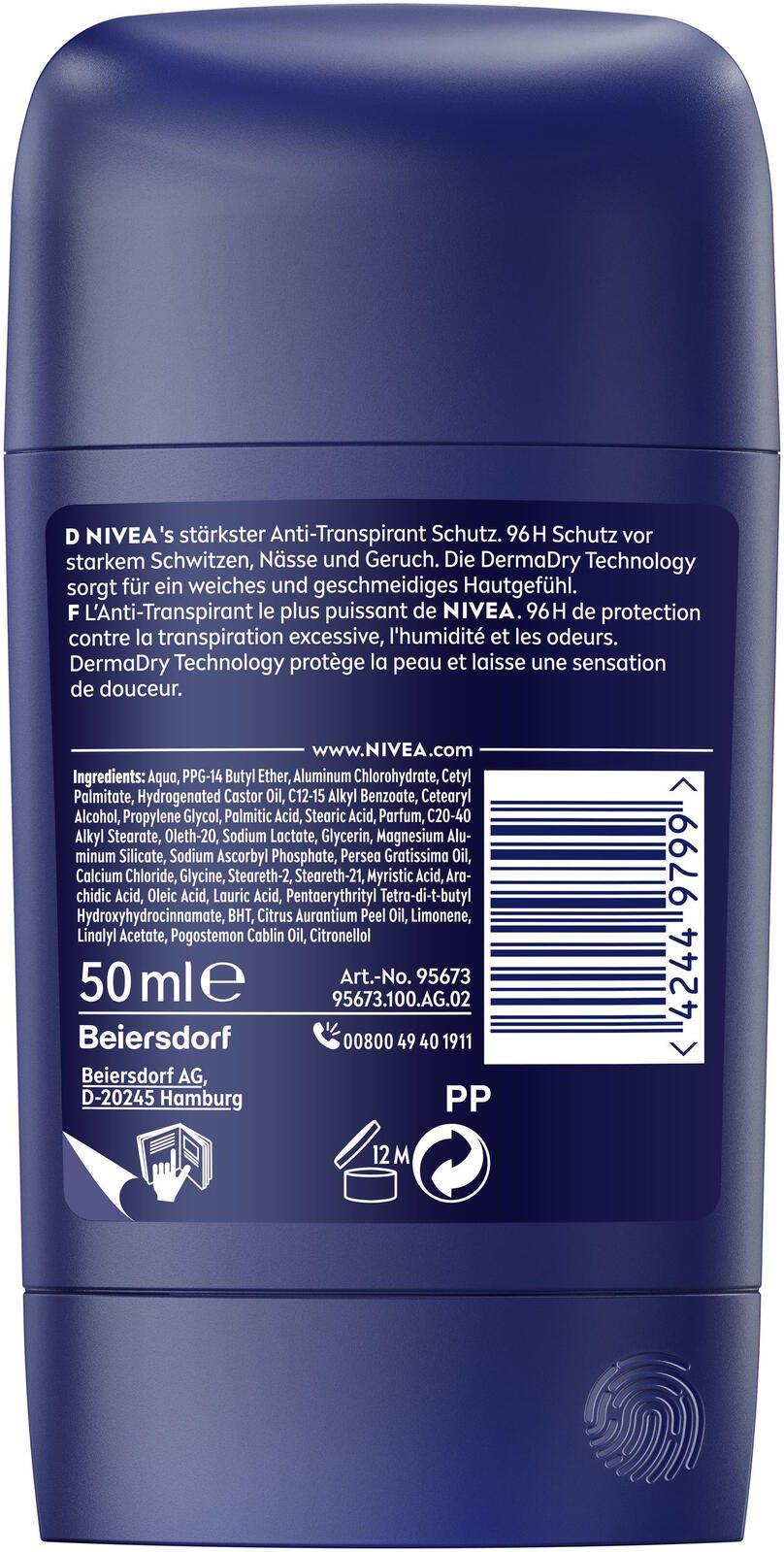 - DERMA 96h Aktiv-Schutz. NIVEAs stärkster Anti-Transpirant Stick. Klinisch nachgewiesener Schutz vor Schweiß und Geruch, der die Haut schützt. Weiches und geschmeidiges Hautgefühl. Leicht aufzutragen. Hautverträglichkeit dermatologisch nachgewiesen.
