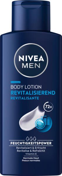 Die NIVEA MEN Revitalisierend Bodylotion bietet eine intensive 24-Stunden-Feuchtigkeitspflege, die speziell auf die Bedürfnisse männlicher Haut abgestimmt ist. Die schnell einziehende Lotion sorgt für ein erfrischendes Hautgefühl ohne klebrige Rückstände und unterstützt die Haut dabei, sich vital und gepflegt anzufühlen. Dermatologisch bestätigt, bietet sie eine zuverlässige Feuchtigkeitsversorgung, die Trockenheit effektiv vorbeugt und die Haut geschmeidig hält.