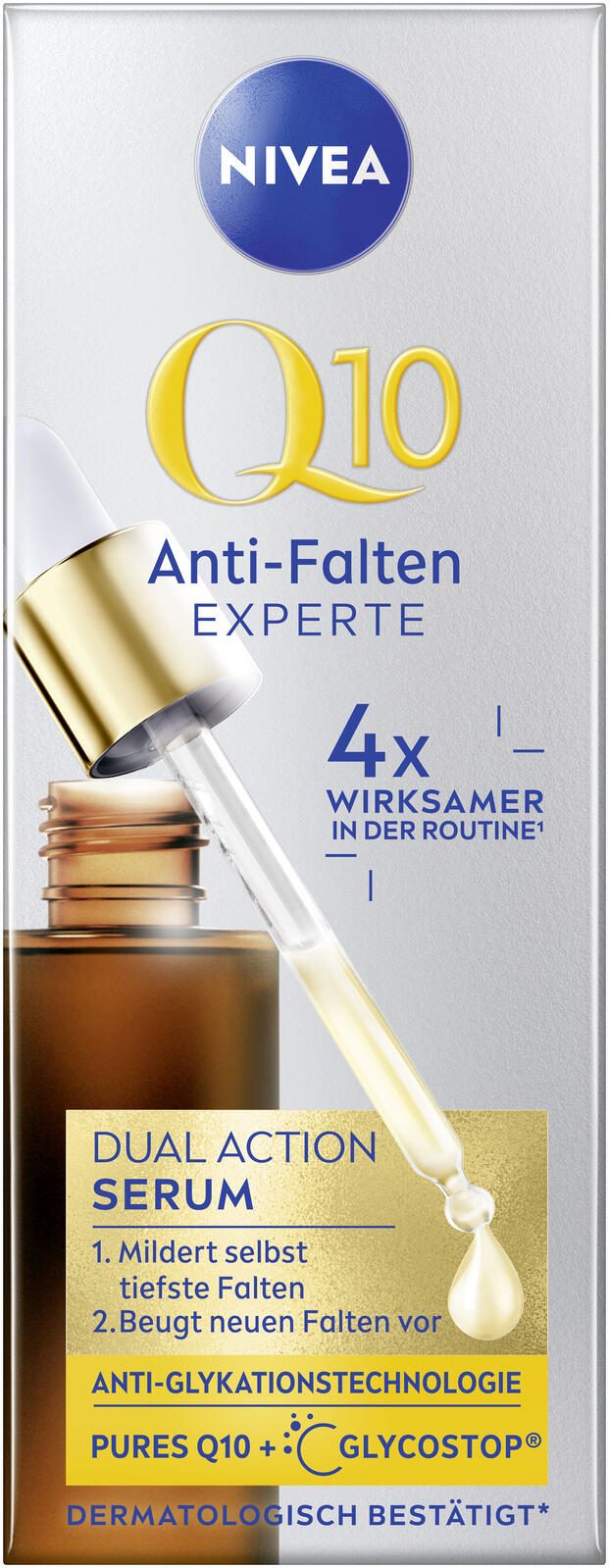 Das NIVEA Q10 Anti-Falten EXPERT Gesichtsserum ist speziell entwickelt worden, um die sichtbaren Zeichen der Hautalterung effektiv zu bekämpfen. Mit seiner innovativen Anti-Glykationstechnologie kombiniert es reines Q10 mit GLYCOSTOP®, wodurch selbst tiefste Falten gemildert und neuen Falten wirksam vorgebeugt wird. Die Formel unterstützt die natürliche Regeneration der Haut und sorgt für ein sofort glatteres und jugendlicheres Erscheinungsbild, was 97 % der Anwenderinnen bestätigen.