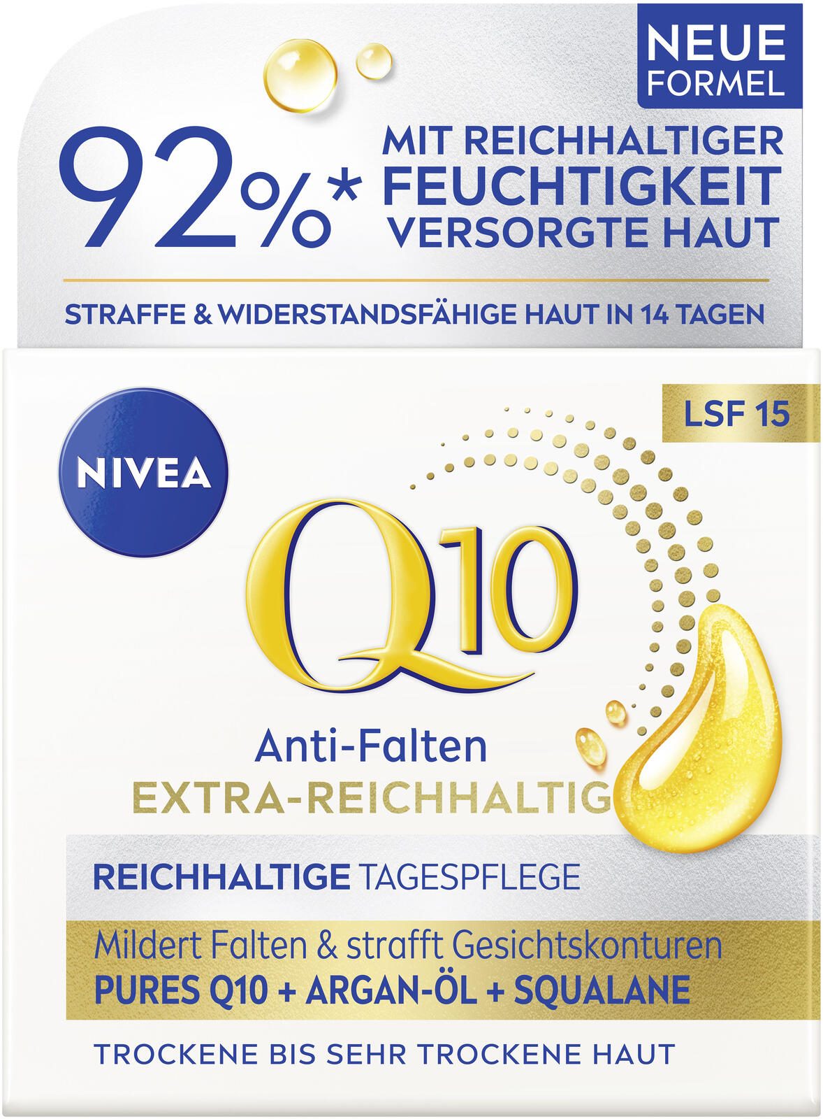 - Schützt vor vorzeitiger, lichtbedingter Hautalterung durch UVA/UVB-Strahlen mit LSF 15. Q10 Anti-Falten Extra-Reichhaltig Reichhaltige Tagespflege mildert tiefe Falten sichtbar innerhalb von 4 Wochen. Die Tagespflege für sehr trockene Haut spendet 24h
