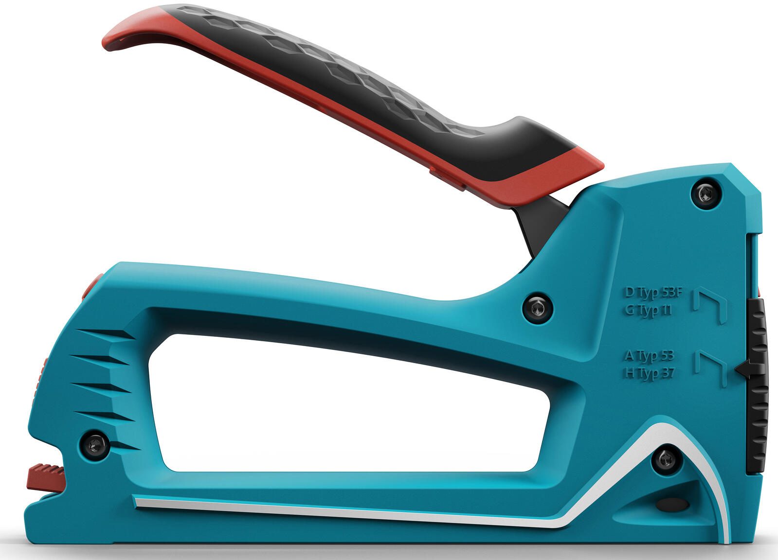 Die Lademechanik des Tackers erfolgt über eine Unterlademechanik, was das Nachladen der Klammern erleichtert und für einen reibungslosen Arbeitsablauf sorgt. Das Fassungsvermögen des Geräts ist großzügig bemessen: Es können bis zu 150 Feindrahtklammern vom Typ A oder H sowie 85 Flachdrahtklammern vom Typ D oder G geladen werden. Diese Kapazität ermöglicht längeres Arbeiten ohne häufiges Nachfüllen.