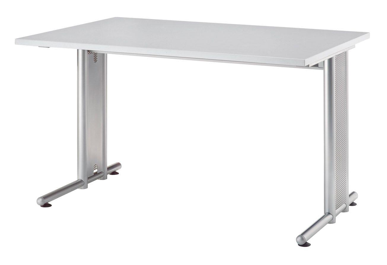 Das Gestell des Schreibtisches besteht aus robustem Stahl, was für eine hohe Stabilität und Langlebigkeit sorgt. Das stilvolle C-Fuß-Gestell in silberner Farbe verleiht dem Schreibtisch nicht nur eine moderne Optik, sondern sorgt auch für zusätzlichen Platz unter der Arbeitsfläche. Durch die lichtgraue Farbgebung fügt sich der Schreibtisch harmonisch in verschiedene Einrichtungsstile ein und lässt sich problemlos mit anderen Möbelstücken kombinieren.