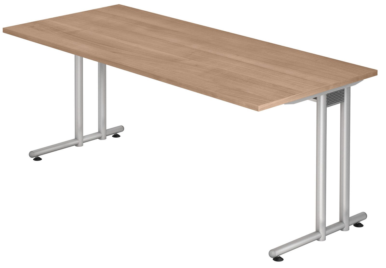 Der HAMMERBACHER Schreibtisch VNS19/N/S in edlem Nussbaum überzeugt durch seine hochwertige Verarbeitung und stilvolles Design. Die Tischplatte besteht aus robuster Spanplatte, die nicht nur langlebig ist, sondern auch eine ansprechende Optik bietet. Das Gestell aus stabilem Stahl in elegantem Silber sorgt für eine hohe Stabilität und Standfestigkeit, während die C-Fuß-Gestaltung eine moderne Note verleiht und gleichzeitig den Platz unter dem Tisch optimal nutzt. Mit den Maßen von 180 cm Breite, 80 cm Tiefe und 72 cm Höhe bietet dieser Schreibtisch ausreichend Platz für Ihre Arbeitsmaterialien, Computer und persönliche Gegenstände. Die großzügige Tischfläche ermöglicht es Ihnen, bequem zu arbeiten, zu lesen oder kreative Projekte zu verwirklichen. Dank des schlichten und zeitlosen Designs fügt sich der Schreibtisch harmonisch in jedes Büro oder Home-Office ein und schafft eine angenehme Arbeitsatmosphäre. Die Farbgebung in Nussbaum verleiht dem Schreibtisch eine warme und einladende Ausstrahlung. Ob in einem klassischen oder modernen Einrichtungsstil, der HAMMERBACHER Schreibtisch VNS19/N/S wird zum Blickfang in Ihrem Raum. Zudem ist er praktisch und funktional, da er über keine zusätzlichen Fächer oder Schübe verfügt, was eine klare und aufgeräumte Optik unterstützt. Dieser Schreibtisch ist nicht nur ein Möbelstück, sondern ein Ort, an dem Sie produktiv sein können. Die Kombination aus ansprechendem Design, hochwertigen Materialien und durchdachter Funktionalität macht ihn zur idealen Wahl für alle, die Wert auf Qualität und Stil legen. Genießen Sie die Vorteile eines durchdachten Arbeitsplatzes, der Ihnen hilft, Ihre Ziele effizient zu erreichen.Technische Daten